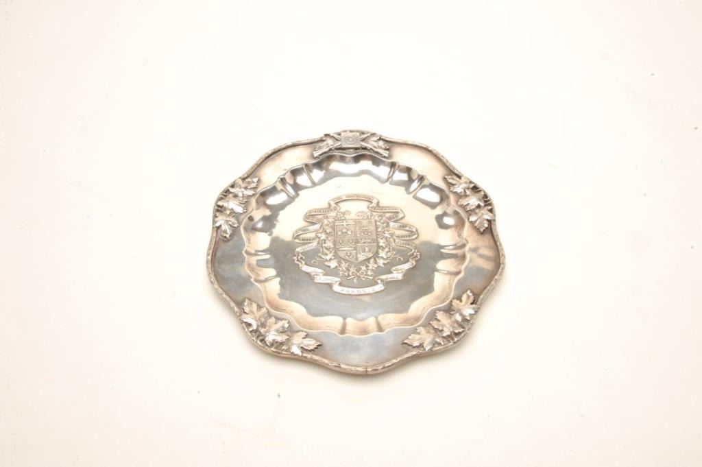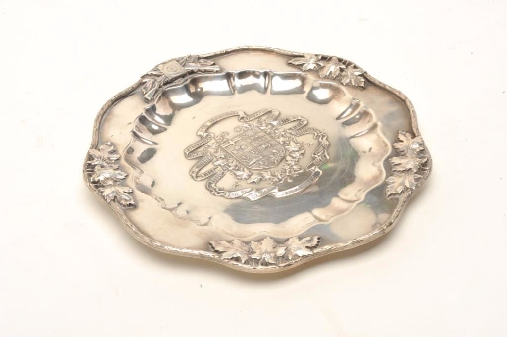 Elaborate sterling silver shooting prize plaque signed “Birks” who were the Canadian equivalent of Tiffany. The plaque measures 11” across the center showing arms, target and oak leafs around the rim. The crest atthe center in relief with scrolls reading “The Dominion of Canada, for Skill in Rifle Shooting, Presented by Members of Civilian Rifle Assoc, Won by G.R. Joynt, Agassiz, Rifle Assoc, 1911”. Weighs 33.5 oz. A coveted prize that shows fine artistry and antiquity. Est.: $1000-$2000