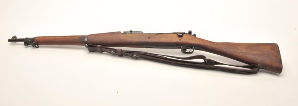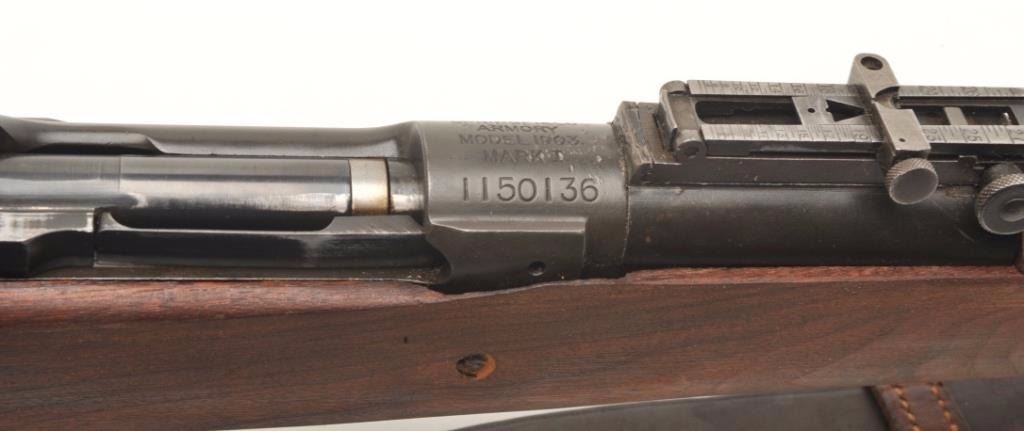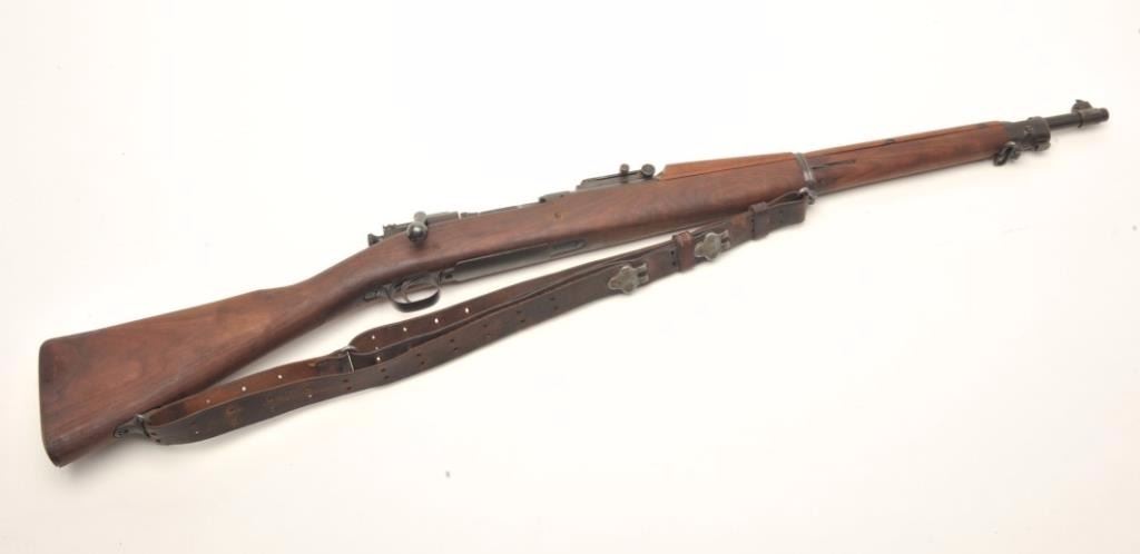 U.S. Springfield Model 1903 Mark I bolt action rifle, .30-06 caliber, 24” S.A. marked barrel dated 10-42, military finish, wood stock and leather sling, S/N 1150136, in overall good to very good condition with agood bore, crisp action and markings and good wood stock with circle P proof and “AA”/”FJA” cartouches on left side of stock above trigger assembly. Est.: $400-$800.