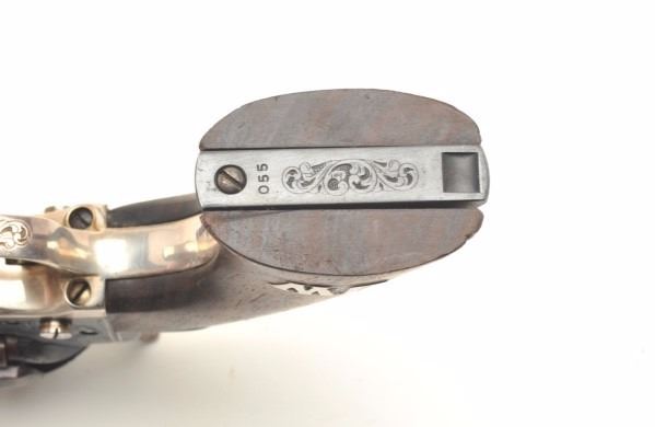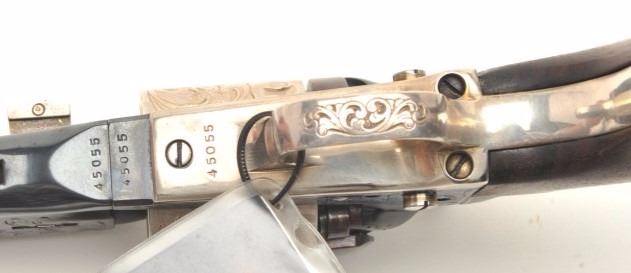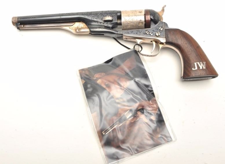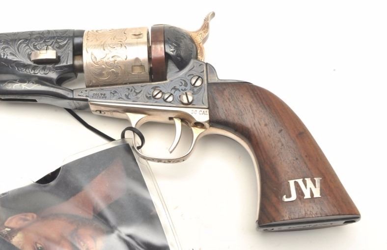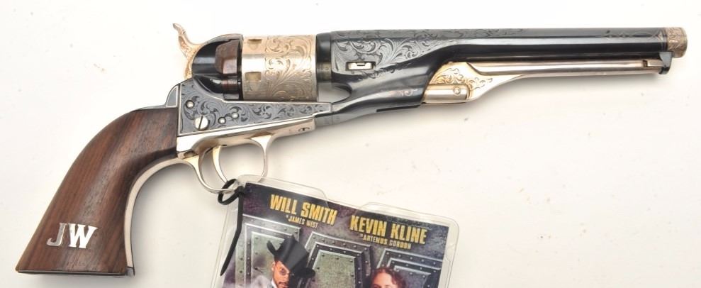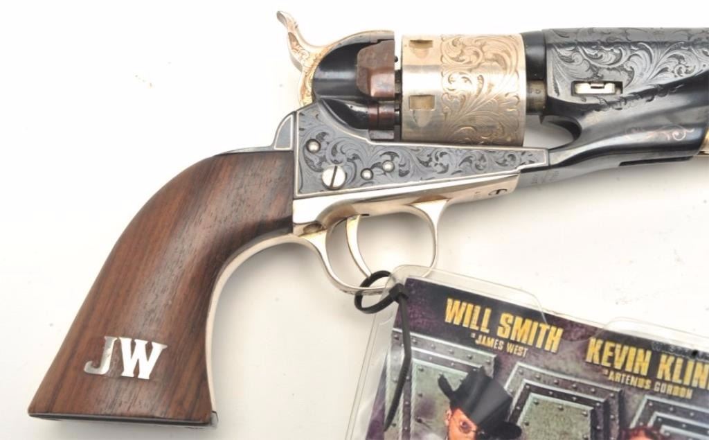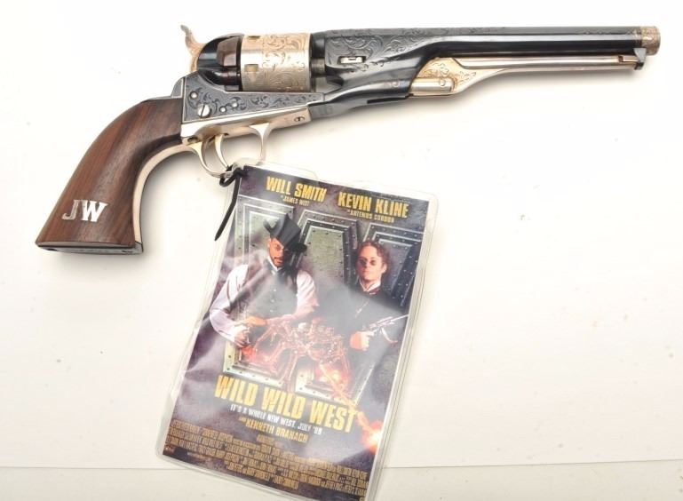 Italian made Colt addressed copies of Colt 1861 Navy revolvers fully engraved and converted to cartridge with J.W. in each grip. See lot 57 of the Stembridge collection where this pair, S/N 45055 and 45209 areincorrectly described in catalog as used in “Josie Wales”. At time of auction we corrected the description as being used in “Wild,Wild,West” remake starring Will Smith as James West. He is often seen with thispair in the movie!! Est.: $2500-$5000