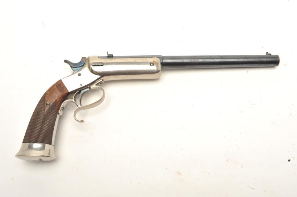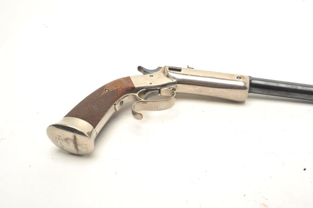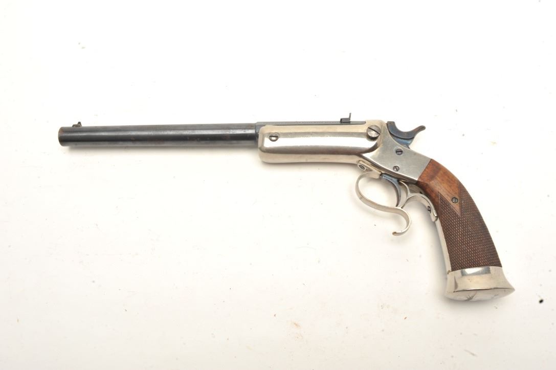 Lot 387 Stevens Lord Target pistol in .32 rimfire, S/N 18. The butt is originally period inscribed “ Buffa