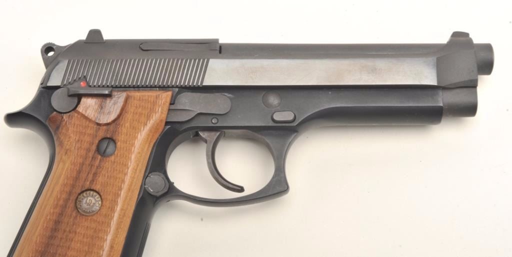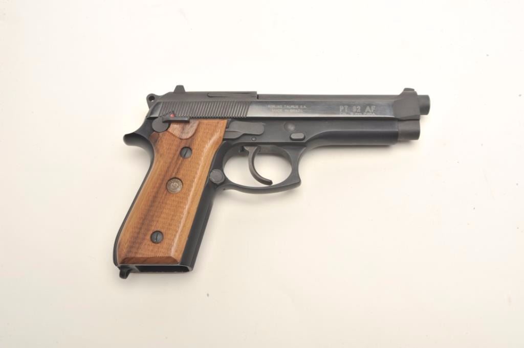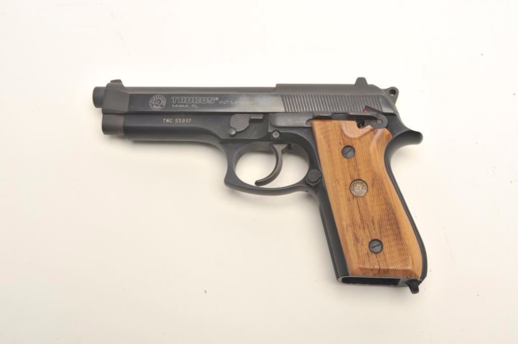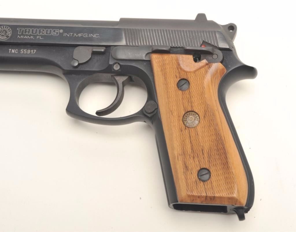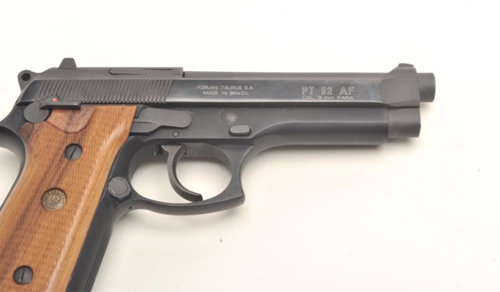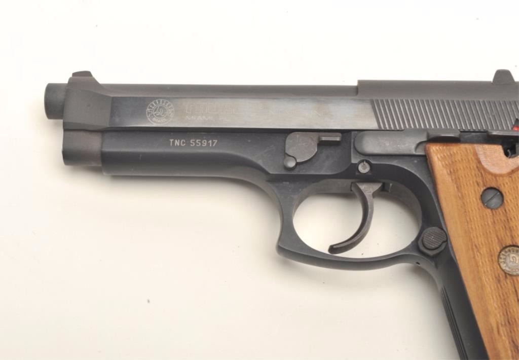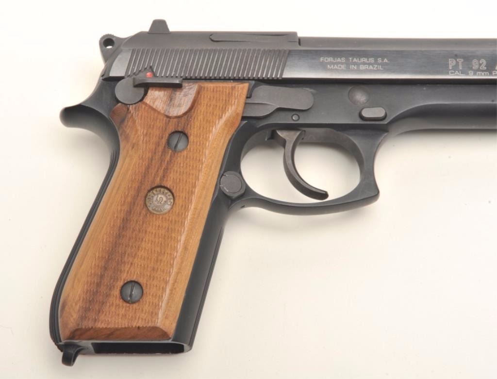 Taurus Model PT 92 AF semi-automatic pistol, 9mm, 5” barrel, blued finish, checkered wood grips, no magazine, S/N TNC55917, in overall fine condition displaying the majority of its original finish, fine bore, action, markings and grips. (Modern/PPT). Est.: $300-$500.