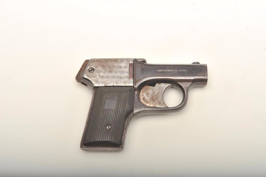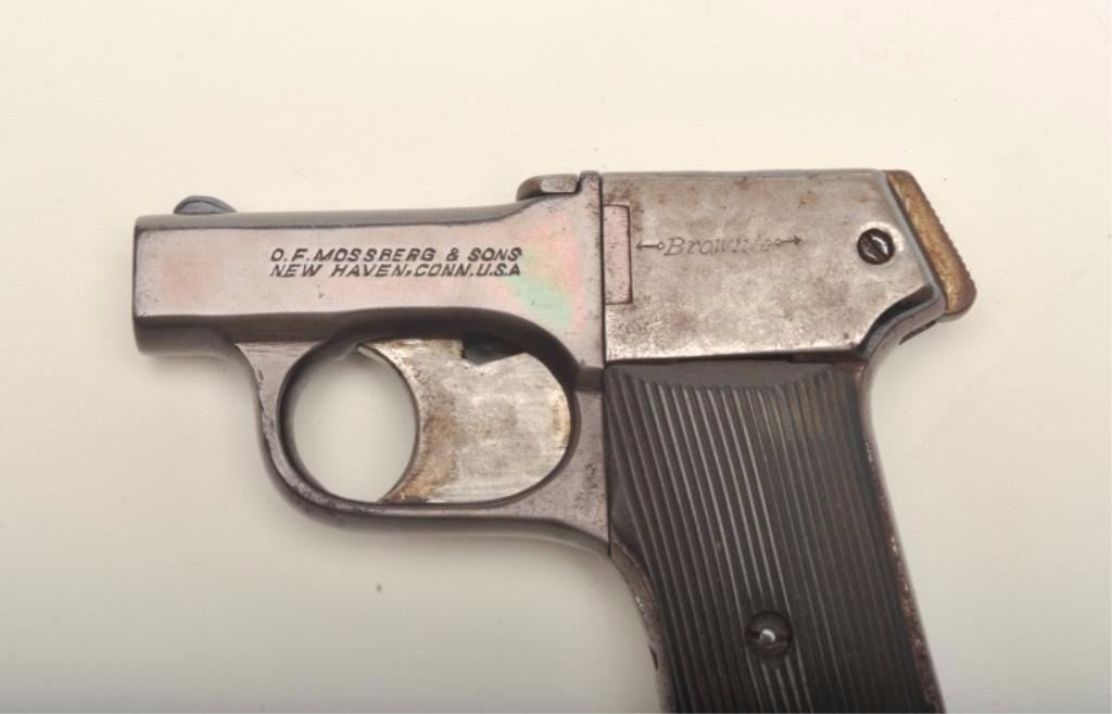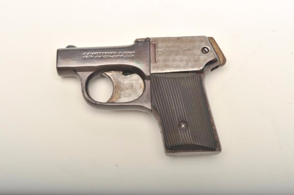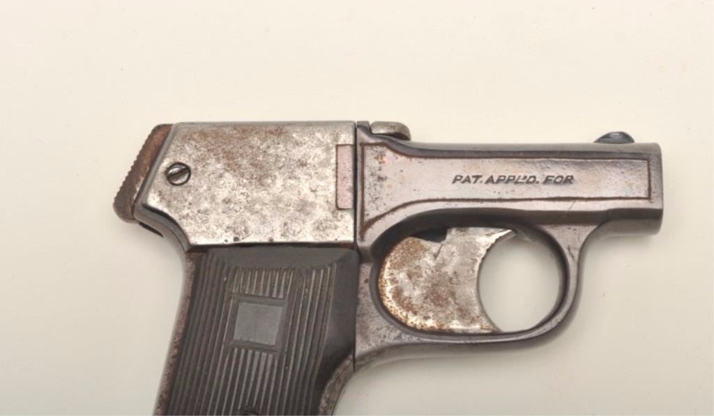 Mossberg “Brownie” pepperbox D.A. in .22 caliber marked “Pat’ applied for”. Re-blued in poor condition and missing internal parts. (C&R) Est.: $100-$200
