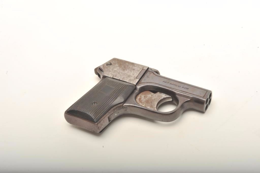 Lot 400 Mossberg “Brownie” pepperbox D.A. in .22 caliber marked “Pat’ applied for”. Re-blued in poor condi