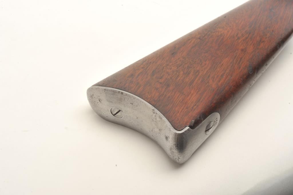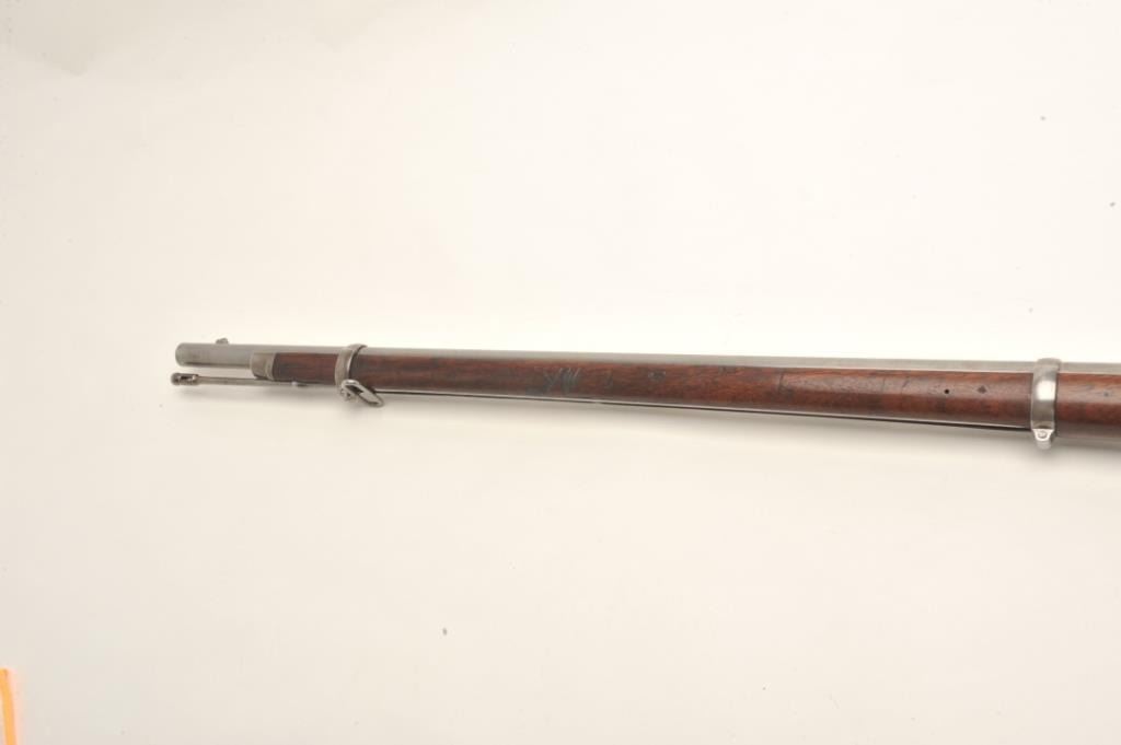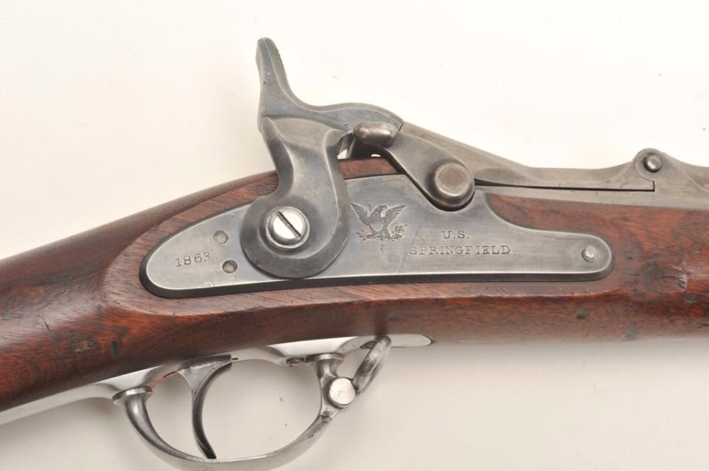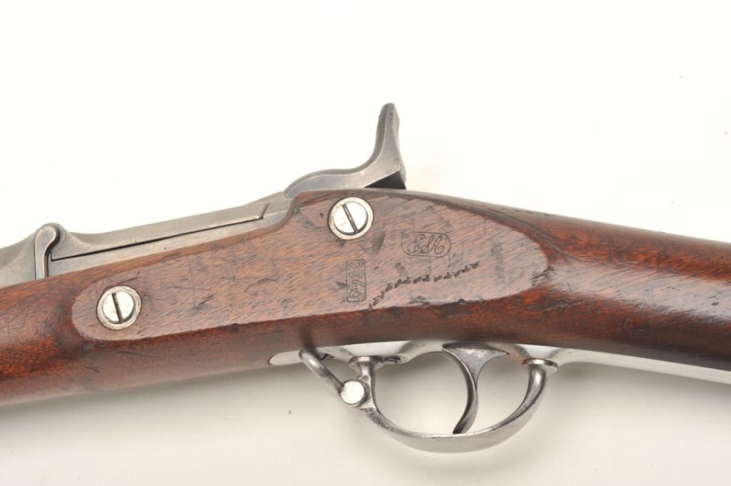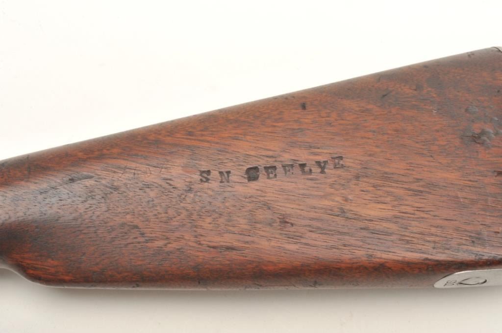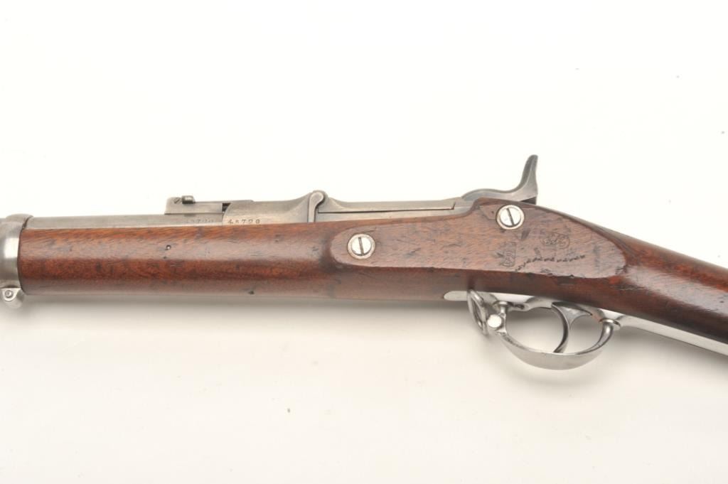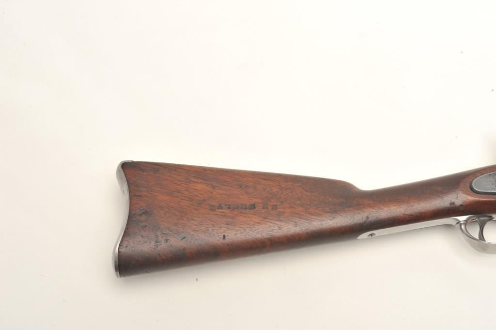 U.S. Springfield Model 1868 (made in 1870), .50 caliber, .32.5” barrel, wood stock, S/N 45720, in overall very good to fine condition showing some cleaning to metal surfaces that have an even grey patina, fine bore,crisp action, sharp markings and very good + stock showing two crisp inspector cartouches on the left side of the stock above the trigger and “S.N. Seelye” stamped on the right side of the butt stock; several oldmars confined primarily to the left forestock area. Would be interesting to research the Seelye name in military records. (Antique). Est.: $600-$1,200.