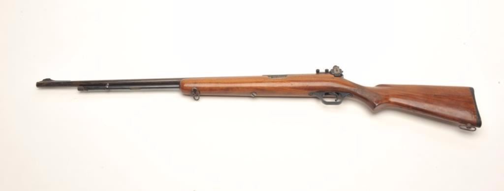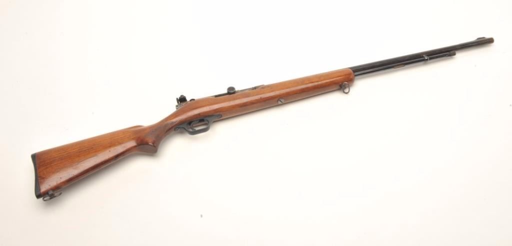): Savage Model 6A semi-auto rifle, .22 Long Rifle caliber, serial #NSNV. The rifle is in good overall condition with a 24” barrel with ramp front sight and rear sight removed. The barrel and ¾ magazine retain themajority of their blued finish with some light surface rust and loss of finish at the muzzle. The receiver shows small amounts of blue in protected areas with moderate surface rust and an otherwise grey patina. Thecheckered wood stock is in good condition with mars and compressions from field use. The butt stock ends with a plastic butt plate. The rifle is equipped with a Lyman 57TS peep sight as added at the rear of theaction. The bore is fair, the action functions and the markings are legible. Est.: $100-$200. (Modern).