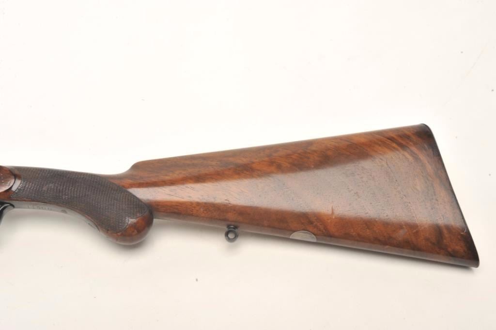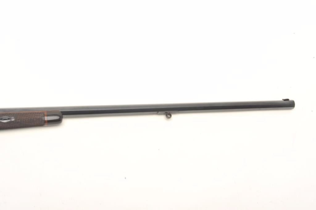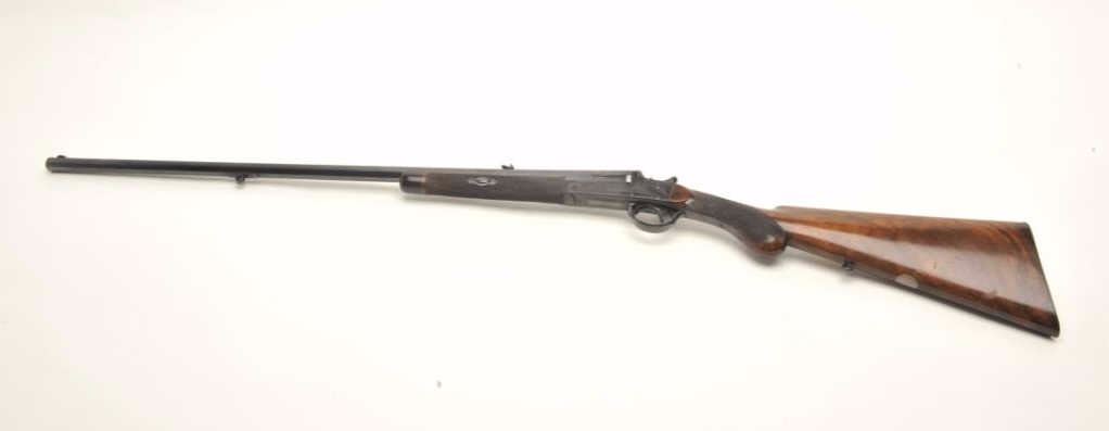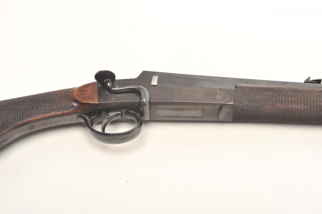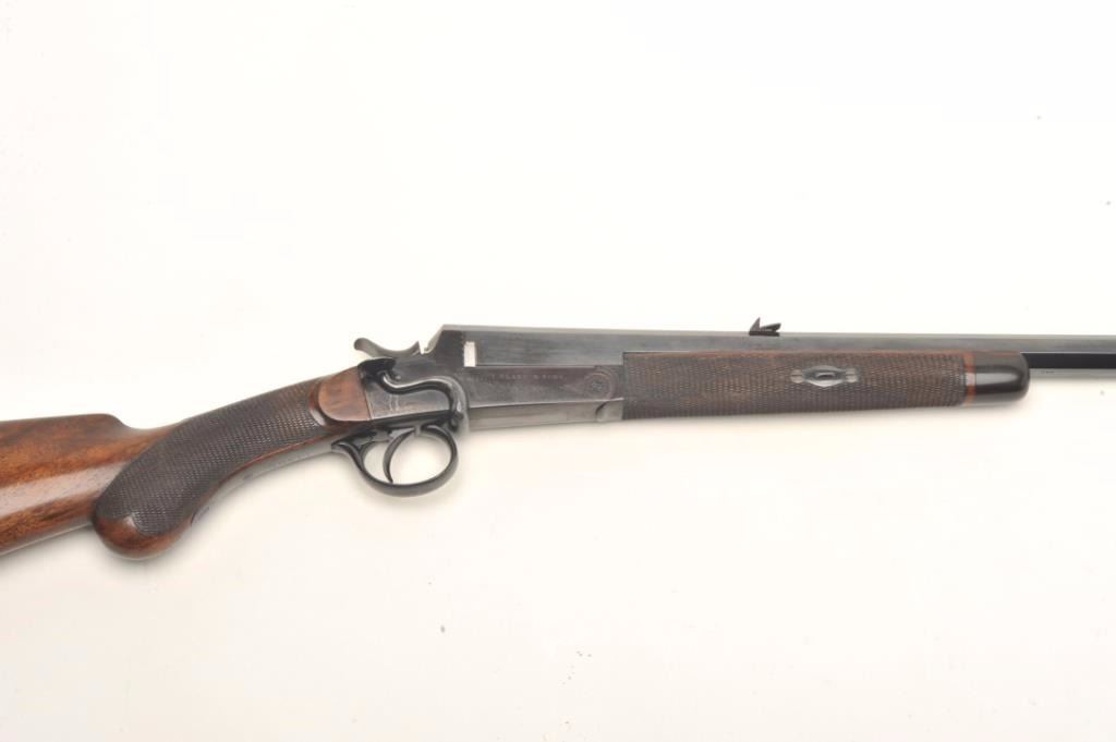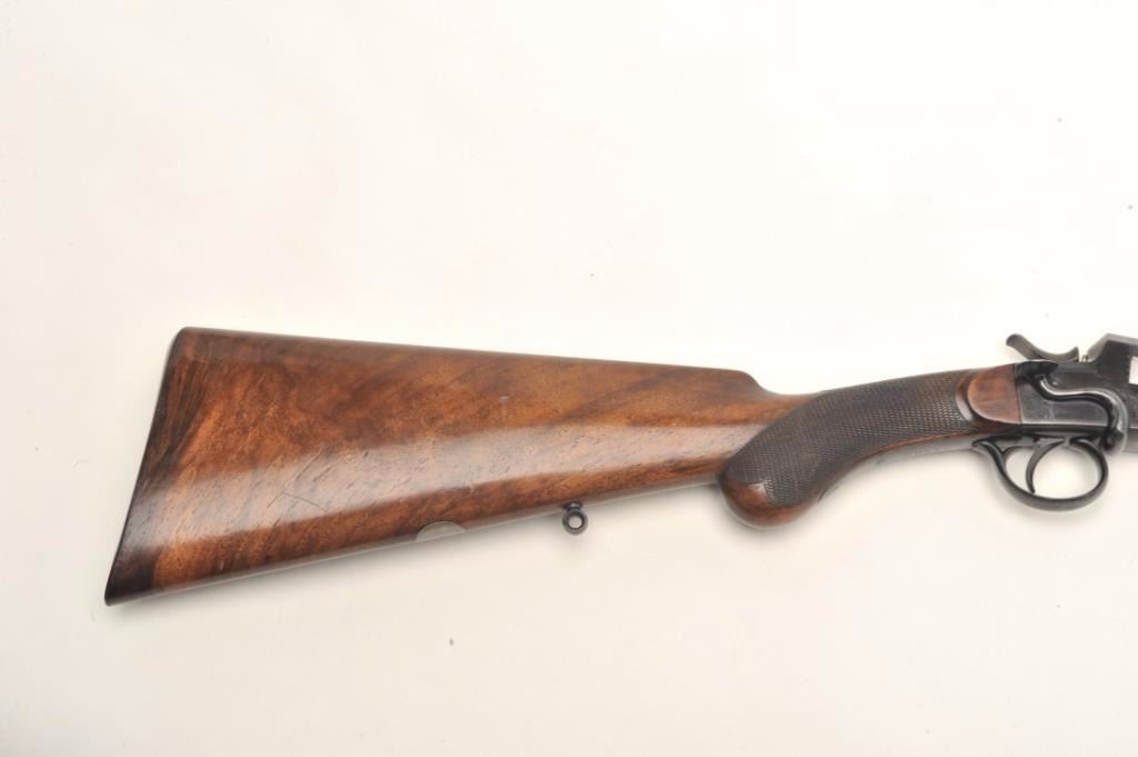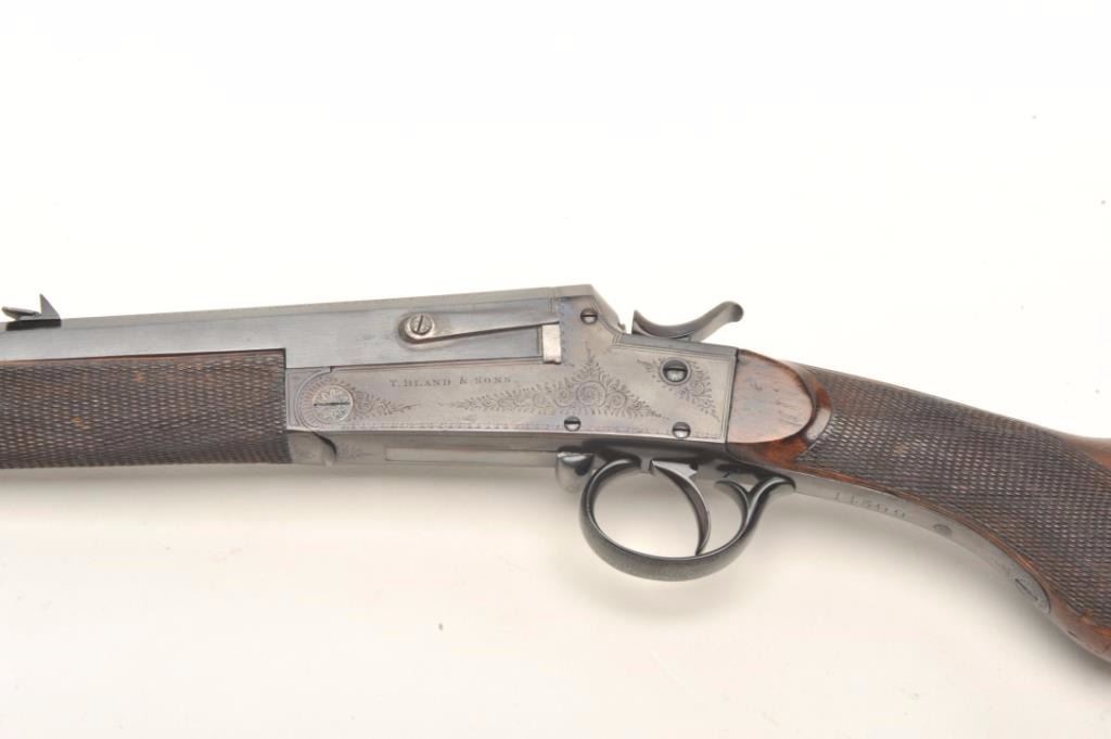 T. Bland & Sons single shot rook rifle, approximately .24 caliber, serial #14599. The rifle is in very good overall condition with a 27” octagon barrel with the entire length filed. The front sight is a post andthe rear is a two leaf folding express style. A sling eye is soldered to the underside. The barrel and receiver show nearly all of an old quality re-blue. The receiver features tasteful scroll engraving. The checkeredwood stocks are in good condition with small mars and some flattening of the checkering. The bore is good, the action crisp and the markings are sharp on this desirable rook gun by a quality London maker. Est.:$600-$900. (Antique).