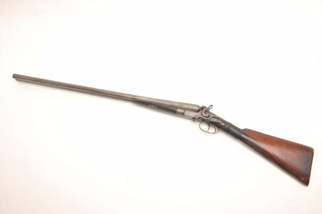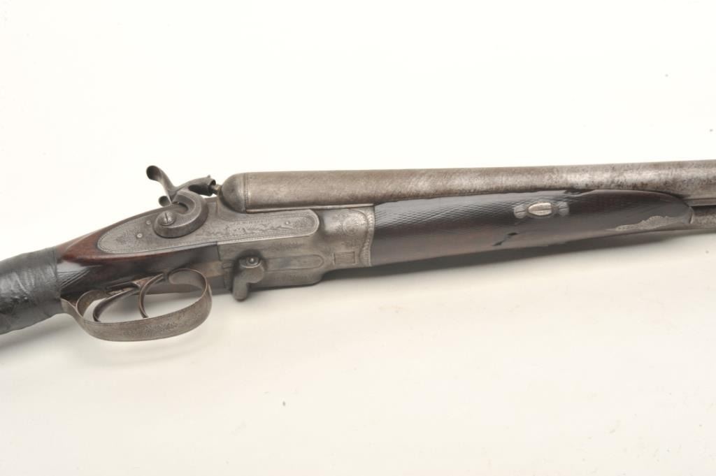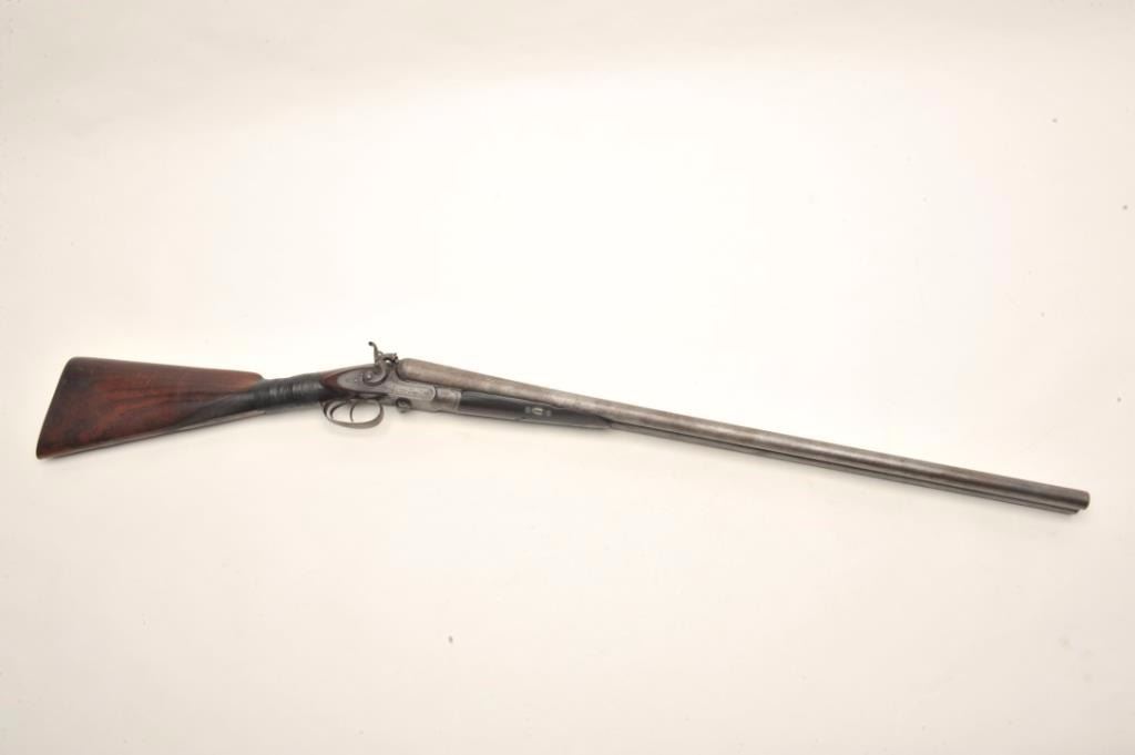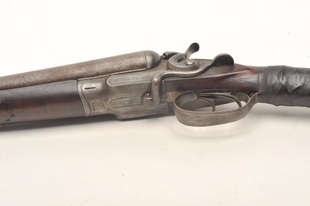 J.B. McHarg & Co., Rome, N.Y. high quality exposed hammer double barrel shotgun showing European quality and numbered 1083; most likely a British manufactured arm and mcHarg was the importer however we were unable toremove barrel key without damage to examine; 12 gauge, 30”Damascus barrel with side lever release circa about 1875-1890; bores fair to good (barrels very thick), locks good, metal good, stock broken at wrist and taped; worthrestoring as it was a quality arm. Est.: $350-$700