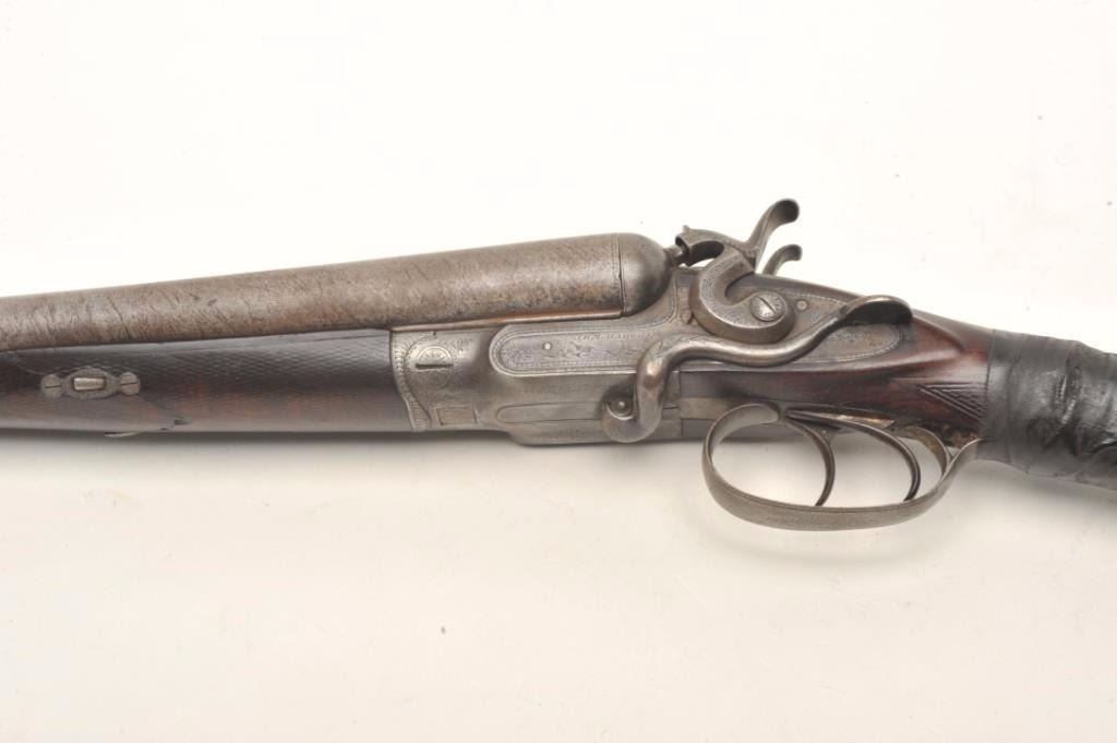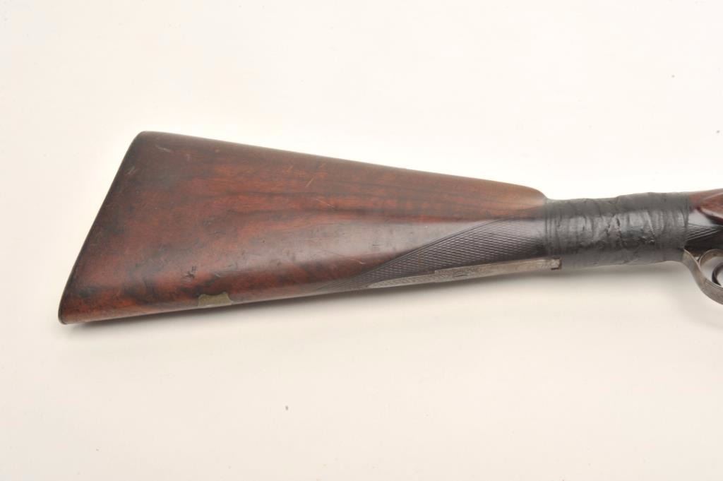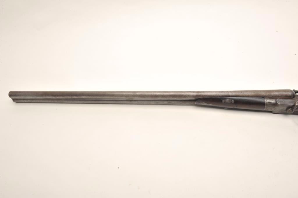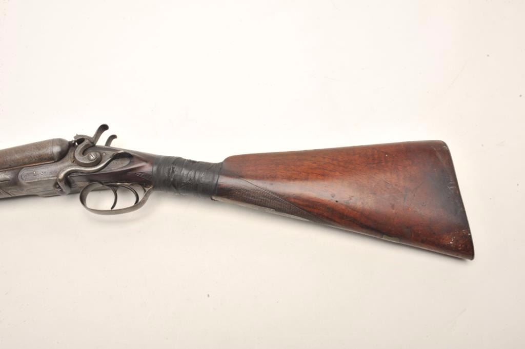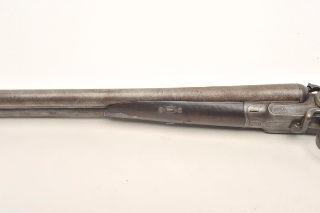 J.B. McHarg & Co., Rome, N.Y. high quality exposed hammer double barrel shotgun showing European quality and numbered 1083; most likely a British manufactured arm and mcHarg was the importer however we were unable toremove barrel key without damage to examine; 12 gauge, 30”Damascus barrel with side lever release circa about 1875-1890; bores fair to good (barrels very thick), locks good, metal good, stock broken at wrist and taped; worthrestoring as it was a quality arm. Est.: $350-$700