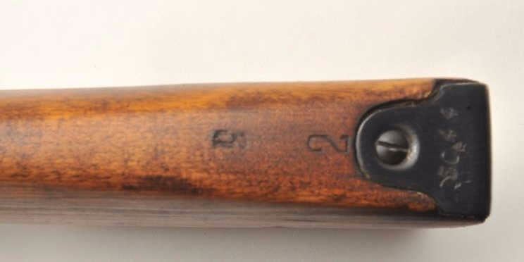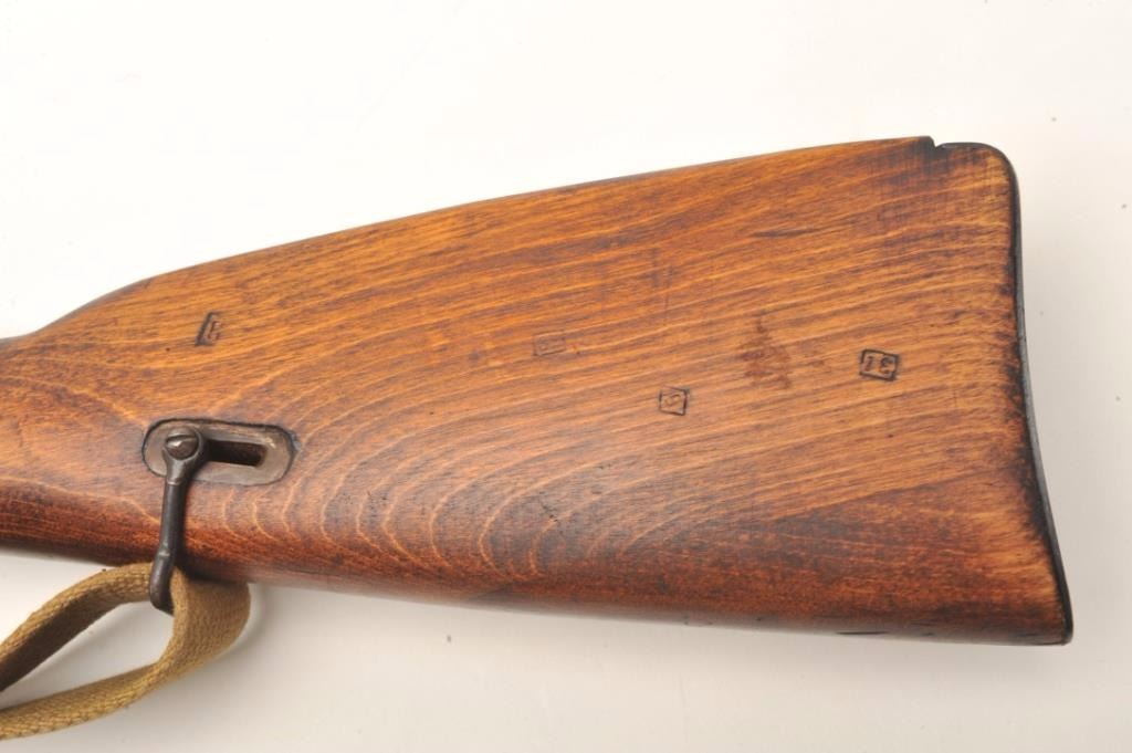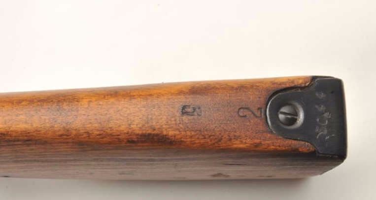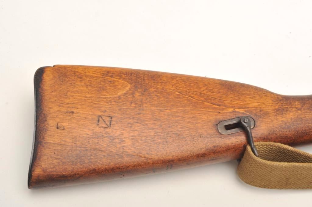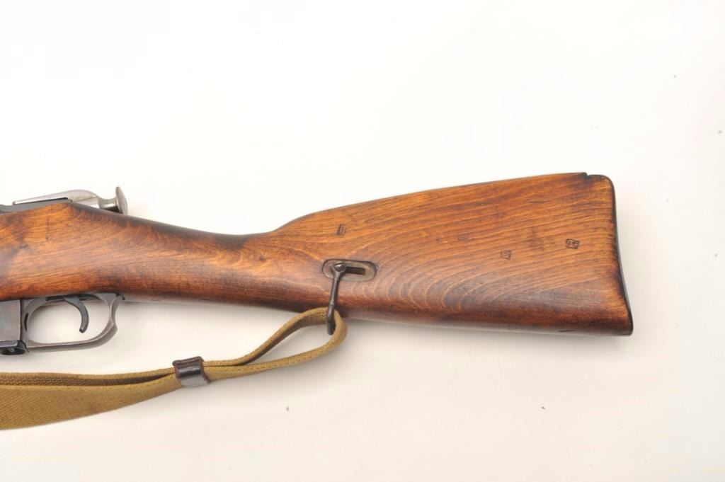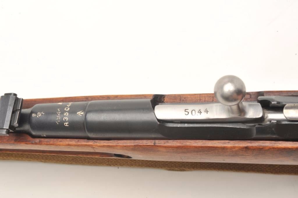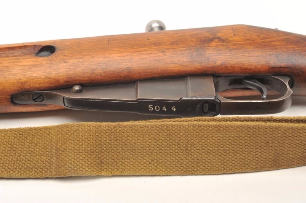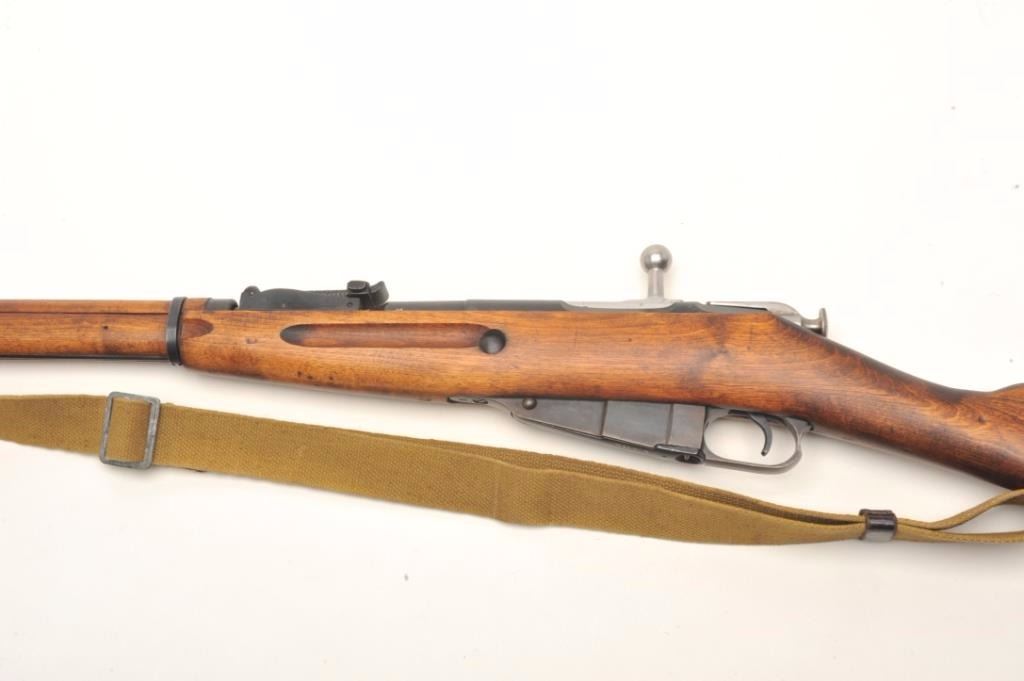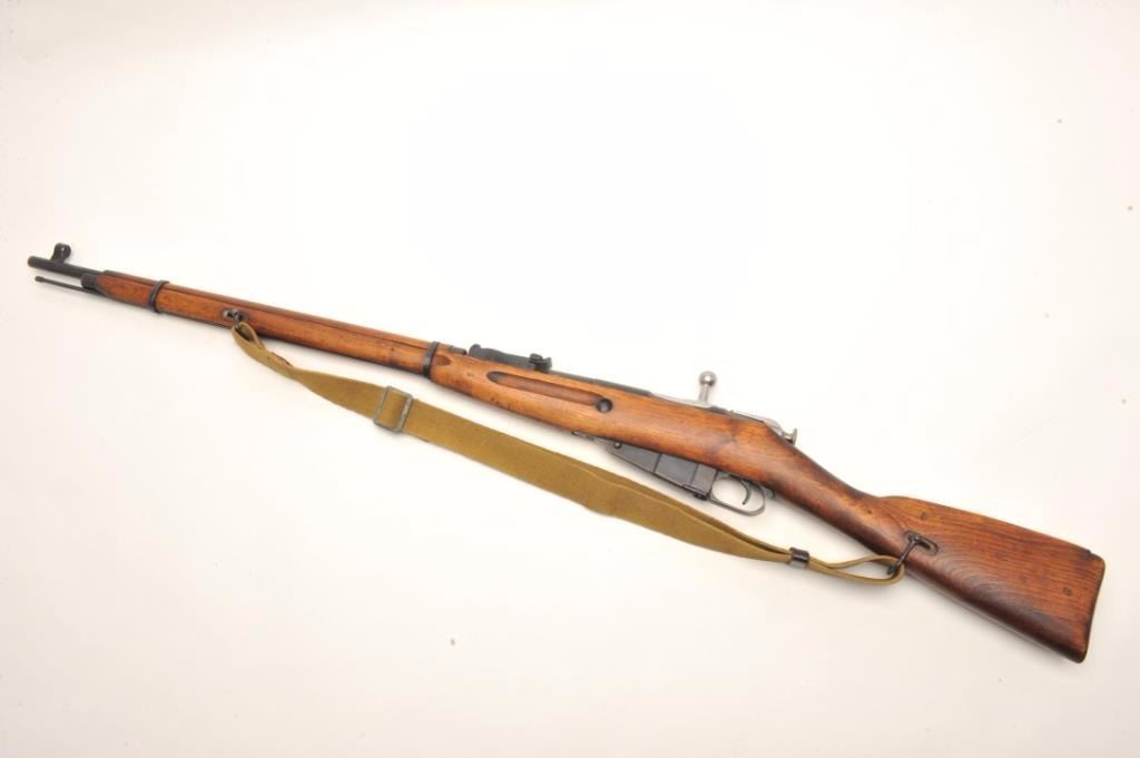 Russian Model 1891 Mosin-Nagant bolt-action military rifle, 7.62mm cal., 29” barrel, import-marked, military blue finish, wood stock, woven tan sling, #A35044 with top of receiver dated “1941”. This gun is inoverall good to very good condition showing considerable military mat black finish, good bore, action, markings and wood stock; adjustable rear sight and hooded front sight; good condition sling. From the Dr. Sterling Fenn collection. Est.: $100-$200.
