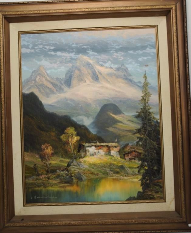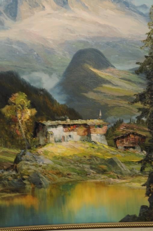 Large framed oil painting of the French Alps, dated 1968 with indistinguishable signature; approximately 52” x 44” overall and beautifully accomplished. One small damage to upper right sky area of canvas.Est.: $400-$800.