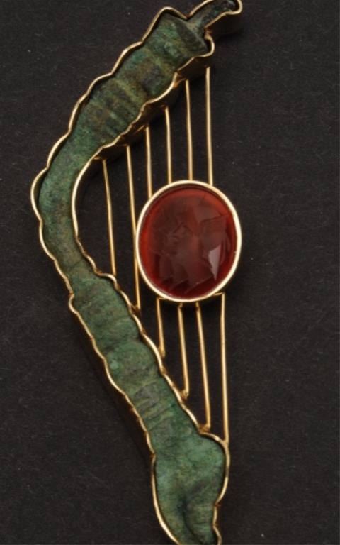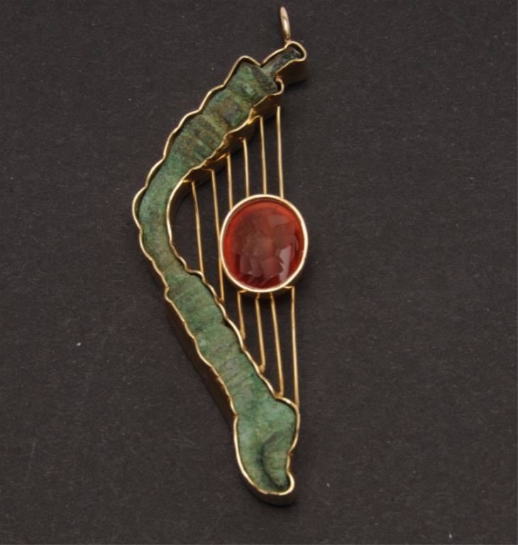 One Irish harp shaped pendant made in 18k yellow gold and set with a carved agate and an abstract oxidized copper form ( weight 15.3gms) . Est. $1,600 -$3,200.