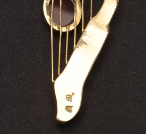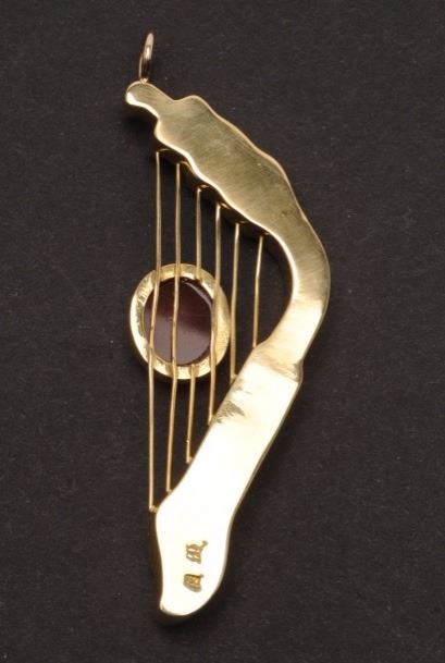 Lot 462 One Irish harp shaped pendant made in 18k yellow gold and set with a carved agate and an abstract