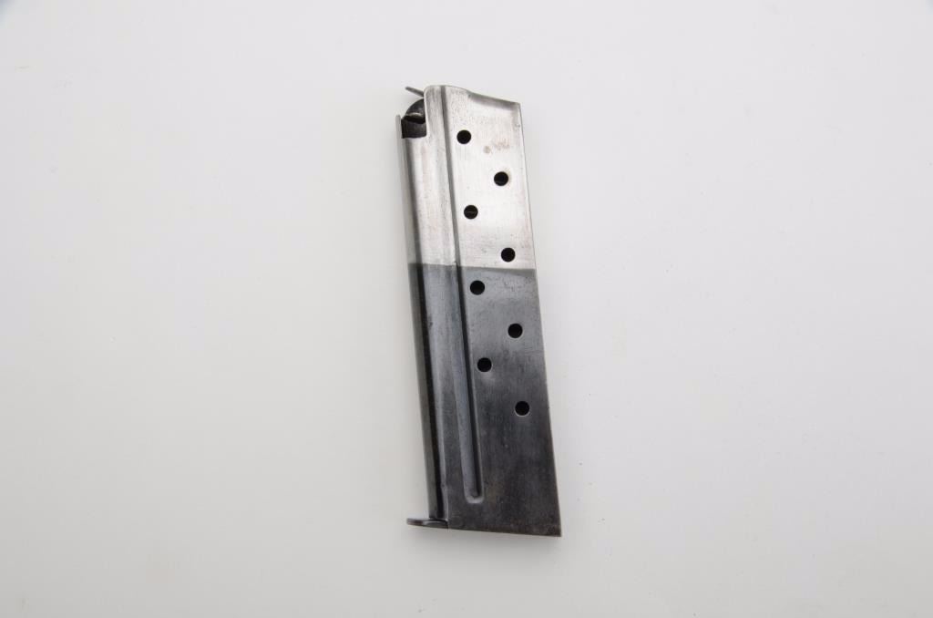 Two-tone magazine in fine condition for the Colt .38 Super semi-auto pistol with floor plate marked “COLT SUPER 38 AUTO”. Est.: $25-$50.