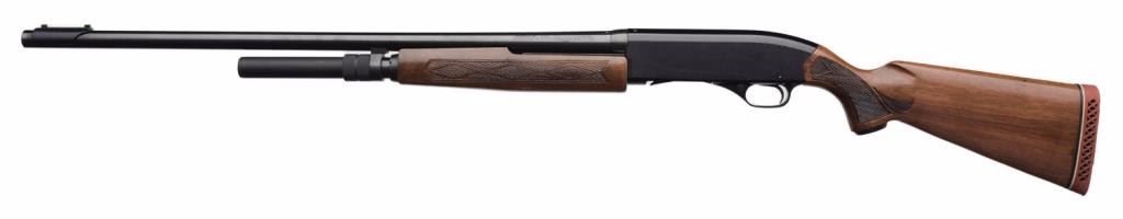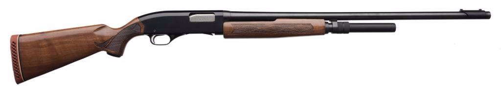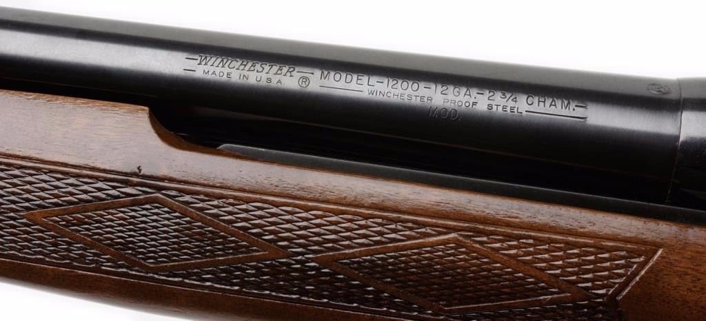 *Winchester Model 1200 pump action shotgun, 12 gauge, 28” barrel, S/N 322905, black finish, checkered wood stocks, green glow front sight; overall fine condition showing little use. Est.: $175-$350.