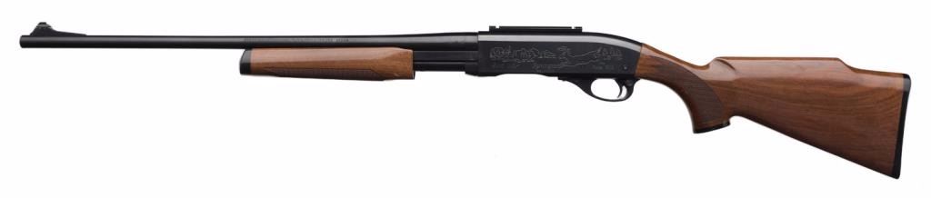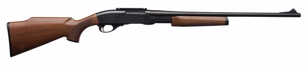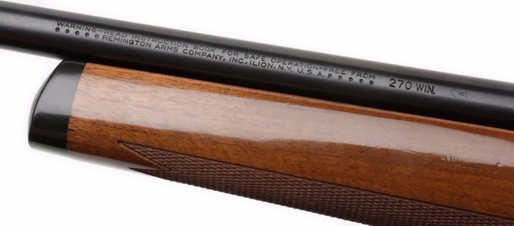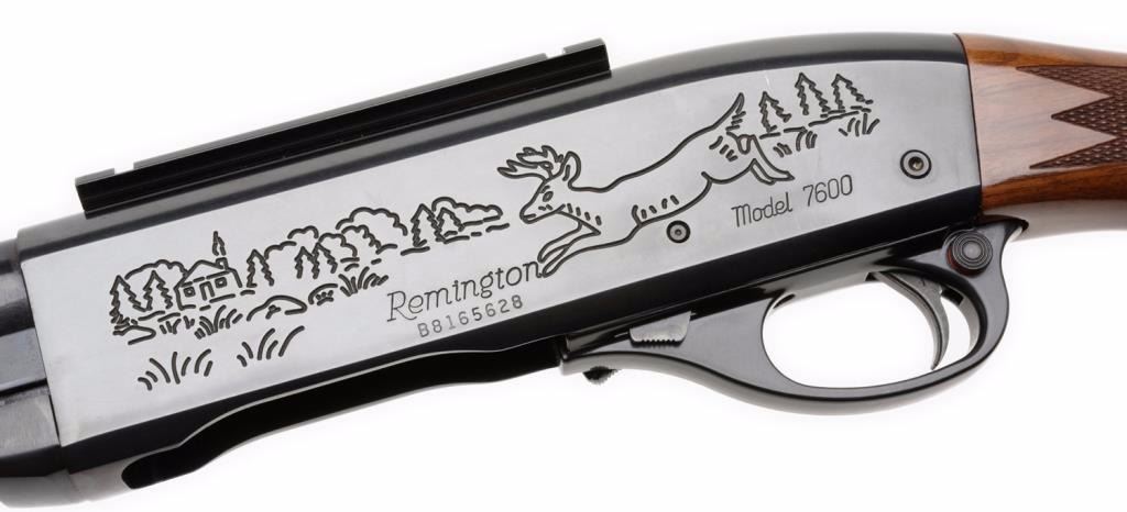 *Remington Model 7600 pump action magazine fed (no magazine) rifle, .270 WIN. caliber, 23” round barrel, S/N B8165628, blued finish, scope rail on top of receiver and barrel tapped for scope mount; checkered wood stocks in overall fine condition showing little use. Est.: $300-$600.
