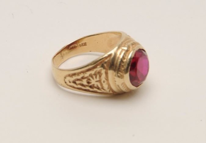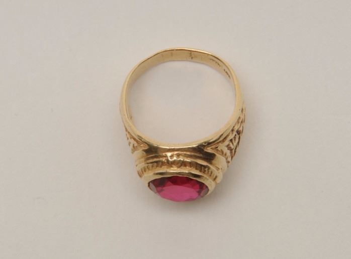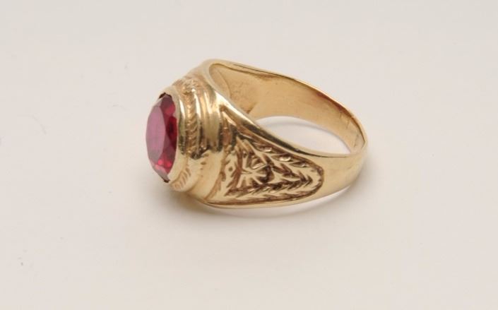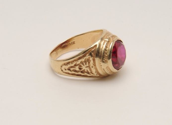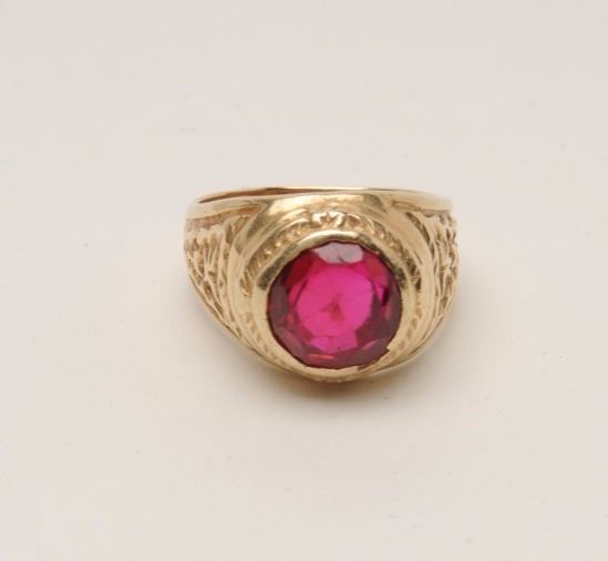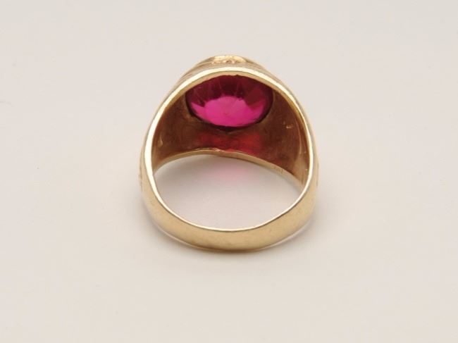 Lot 471 Mens ring in 14kt yellow gold weighing 8.7 grams with fancy natural red garnet of approx. 5ct size