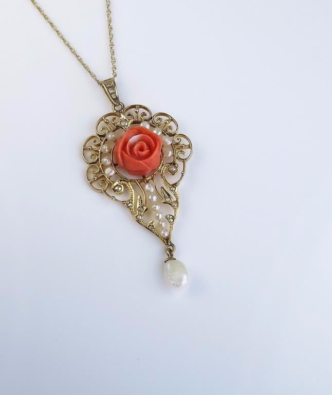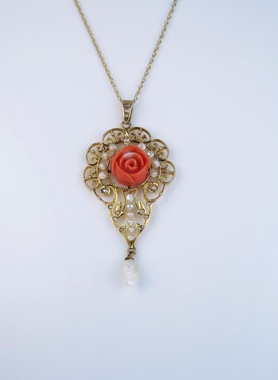 Antique Edwardian Coral and Seed Pearl Pendant with a delicately detailed floral design featuring a hand carved coral rose embellished with 25 seed pearls with intricate filigree with baroque pearl at thebottom. This lovely feminine piece is hand crafted in 10 karat yellow gold and measures 50 x 25 mm in size with a 10 karat 18” yellow gold chain. Retail $1,000-$1,500 Estimate $600-$900