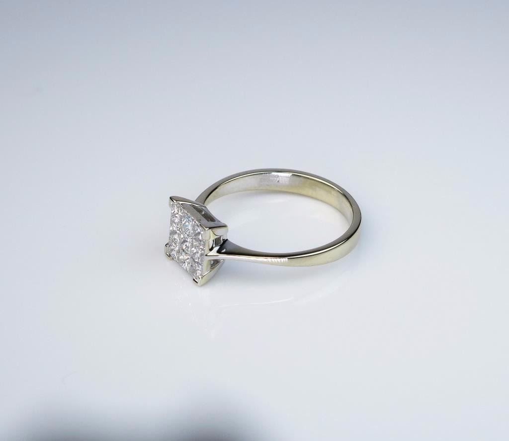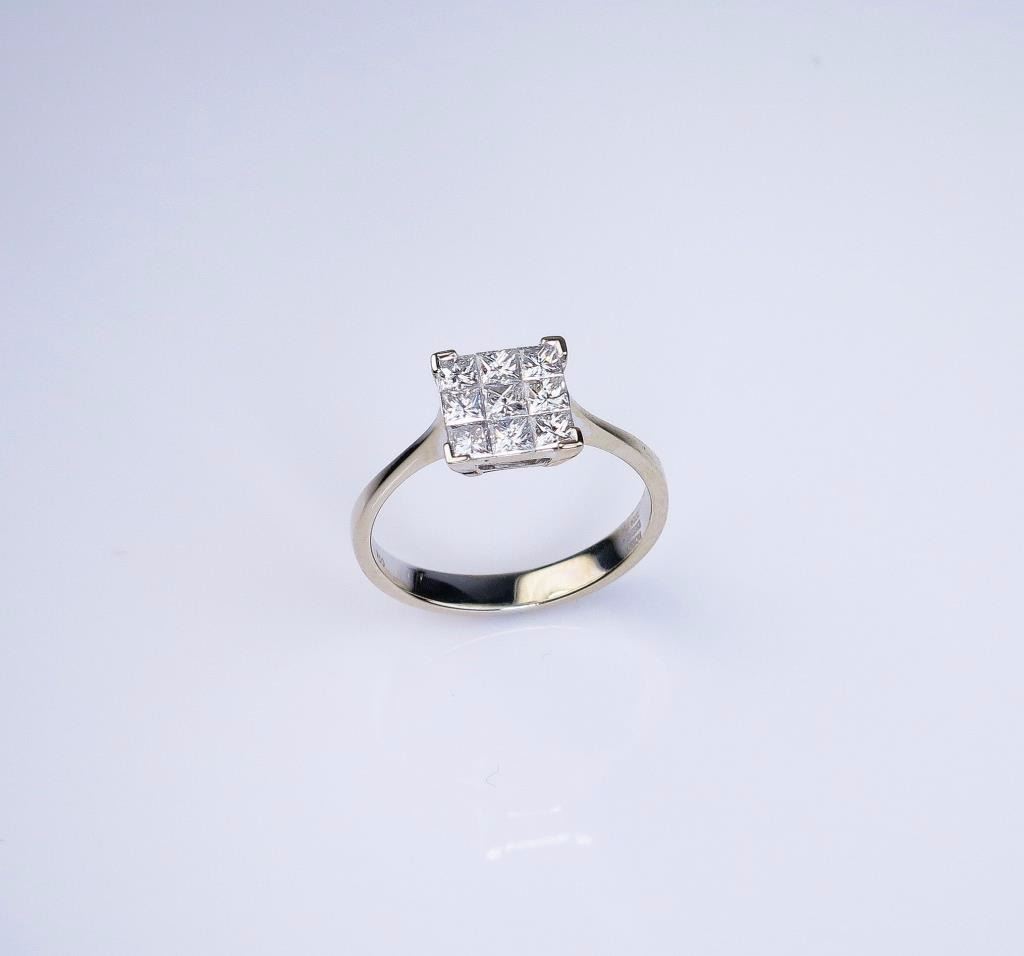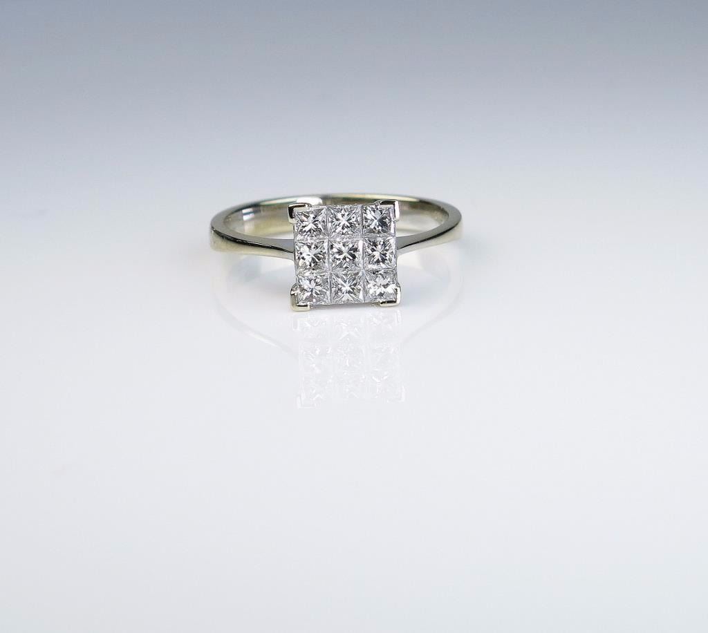 Lot 482 Fine Italian Designer ‘Mosso Essenza” Diamond Ring featuring 9 princess cut diamonds invisibly set