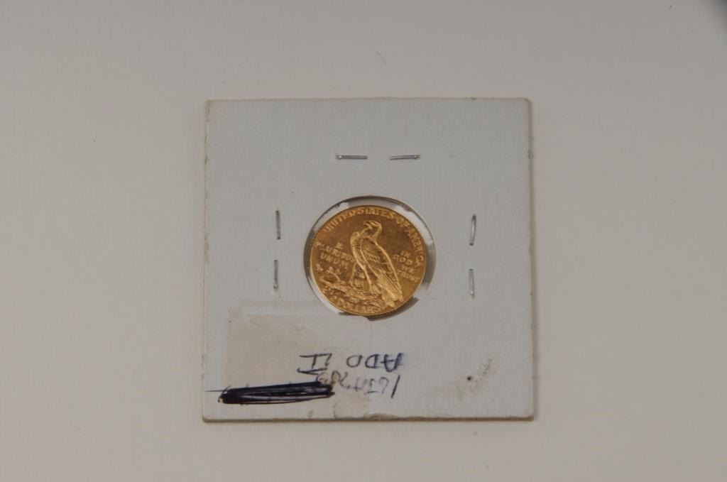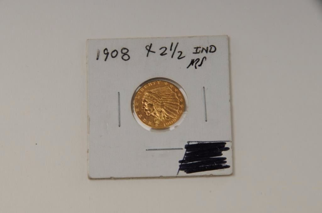 Lot 496 2 1/2 Dollar Indian Head gold piece dated 1908 not pro graded, in old holder marked M.S., from est