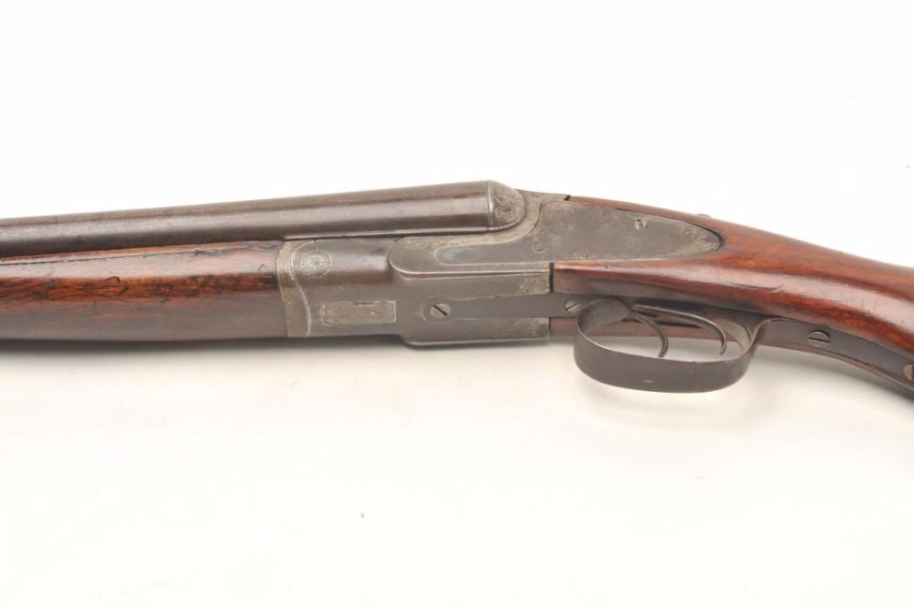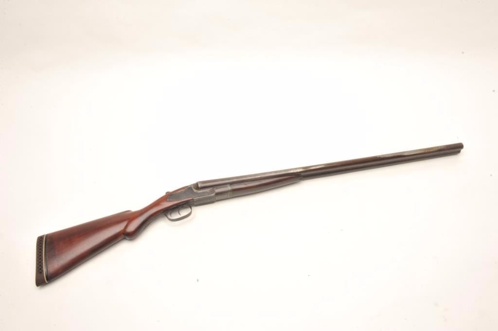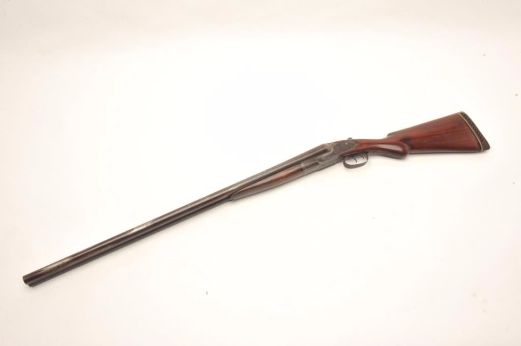 L.C. Smith S x S shotgun, 12 gauge, serial #33931. The shotgun is in good overall condition with 30” barrels with a full-length filed rib and steel bead front sight. The barrels have gone to patina with severalareas that have been polished bright. The receiver and side plates are all dark grey patina with light surface erosion noted. The smooth wood stocks are in good condition with small mars, dents and compressionsconsistent with field use. The butt stock ends with a ventilated rubber pad and a 14” LOP. The bores are fair, the action crisp and markings are legible. Est.: $300-$600. (Antique).