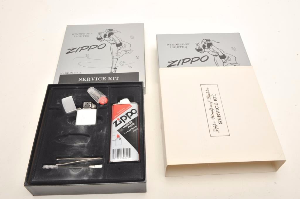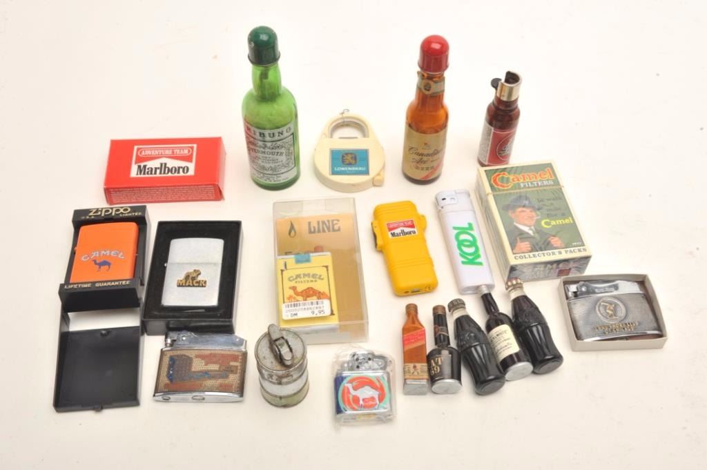 Lot of collectible advertising lighters and more including 2 Zippo 60th Anniversary Windproof Lighters in factory cases and cardboard sleeves; 2 Zippo Windproof Lighter Service Kits in factory box/sleeve; acommemorative lighter in wood casing from the Palace Station in Las Vegas celebrating the Seventh Annual Convention (June/1993) of the International Lighter Collectors; also a number of small pocket lighters in the shapeof miniature bottle of liquor. (Reference: James Flanagan’s definitive work “The Big Book of Cigarette Lighters”). Est.: $400-$600.
