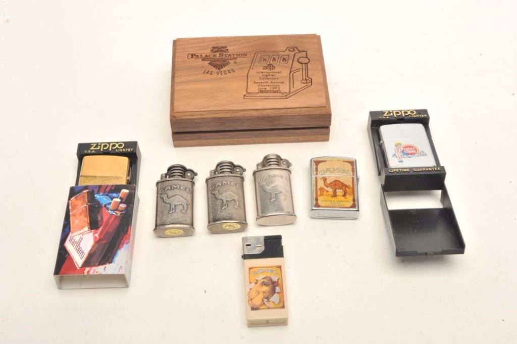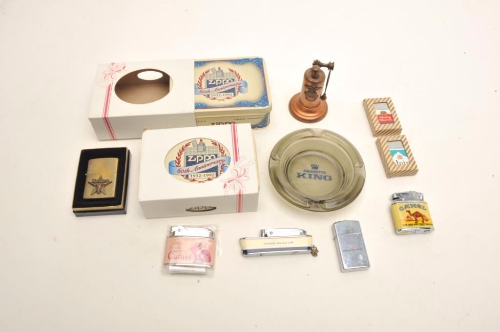 Lot 517 Lot of collectible advertising lighters and more including 2 Zippo 60th Anniversary Windproof Ligh
