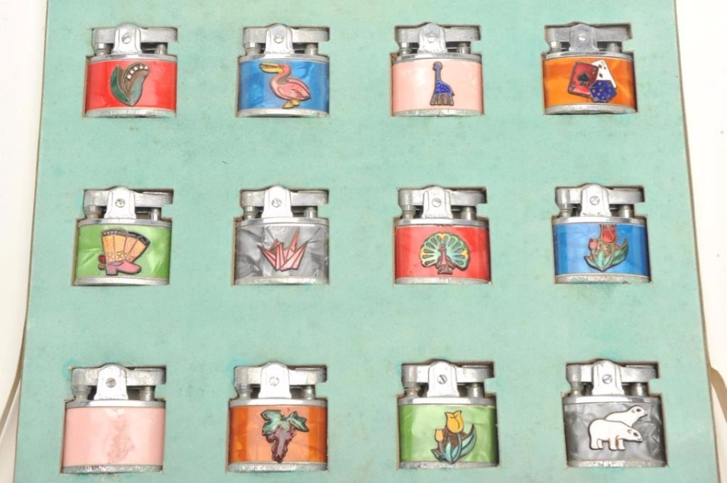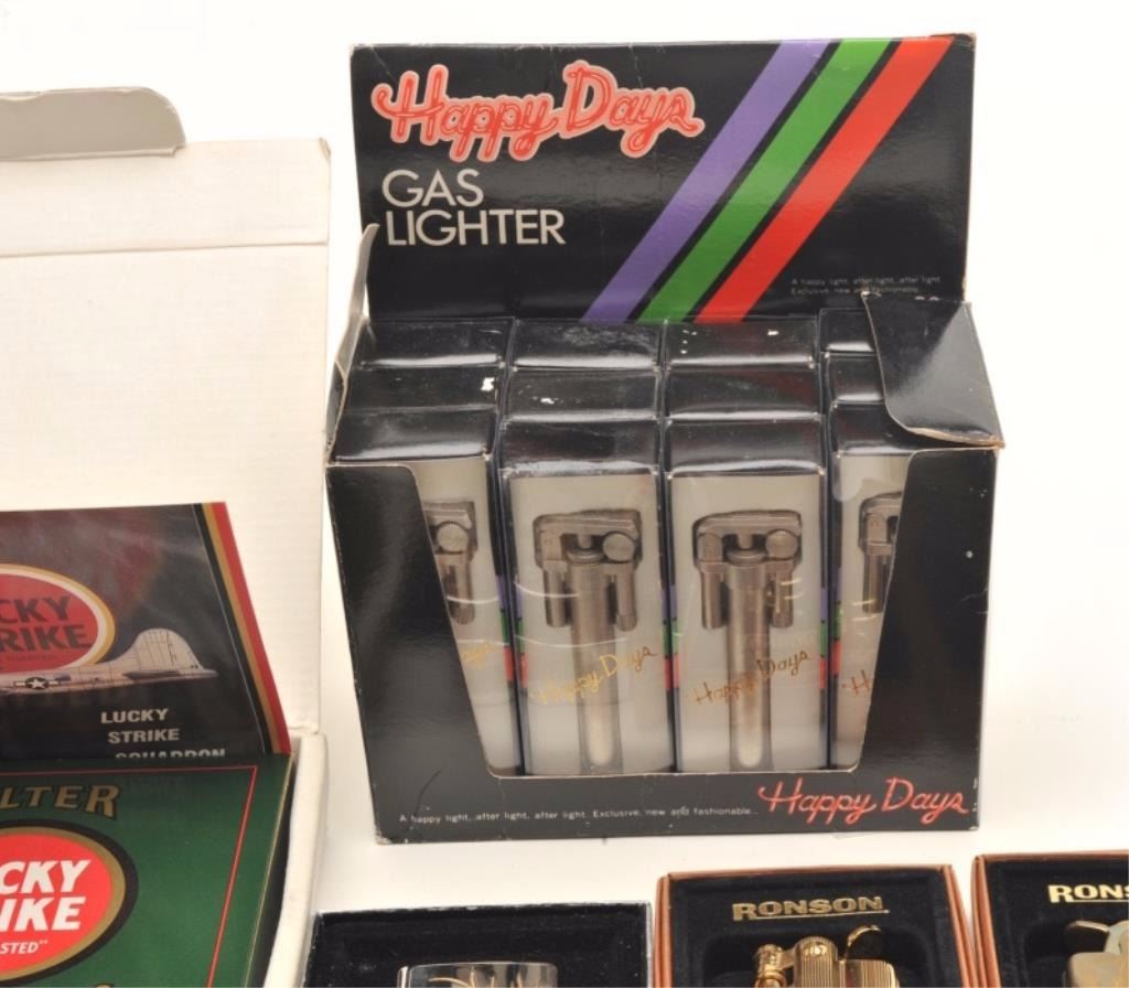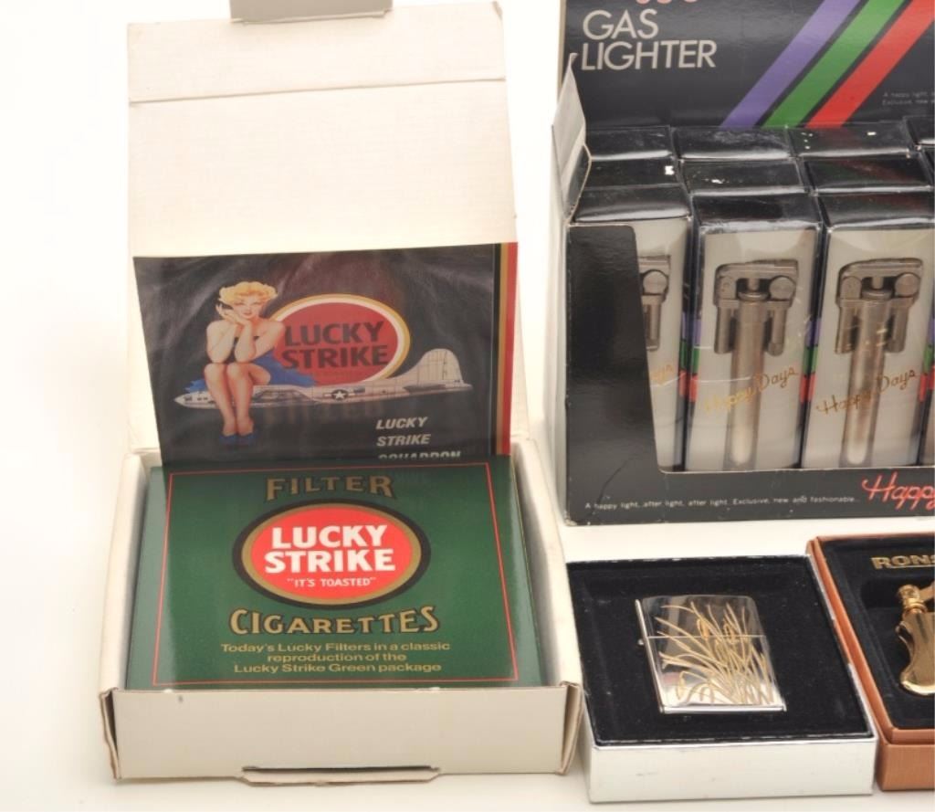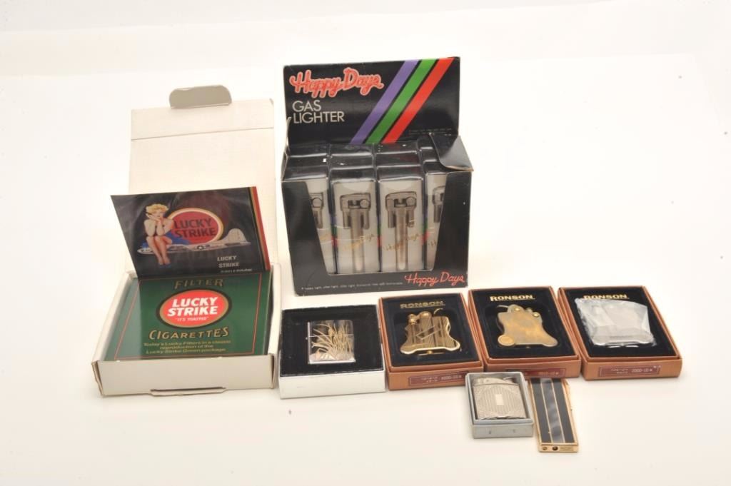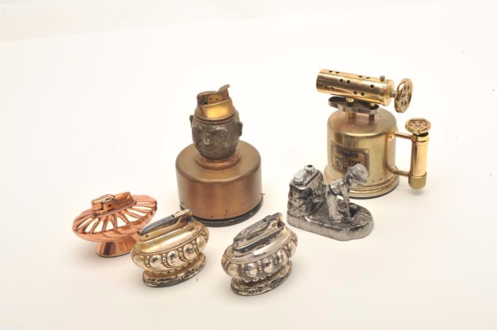 Lot of misc. vintage table and pocket lighters by makers Ronson, Evans and Zippo, etc., including a case of 12 individually packaged “Happy Days” gas lighters; a Satellite store display of 12 differentfashion lighters; a matchbook dispenser; a metal lift arm nude figural table lighter (ca. 1920’s); a brass music box table lighter that turns the “two faced” man when lit; made by Evans and ca. 1930’s; a brass butanetorch table lighter made by Pyro Star, ca. mid-1960’s and more. (Reference: James Flanagan’s definitive work “The Big Book of Cigarette Lighters”). Est.: $350-$500.