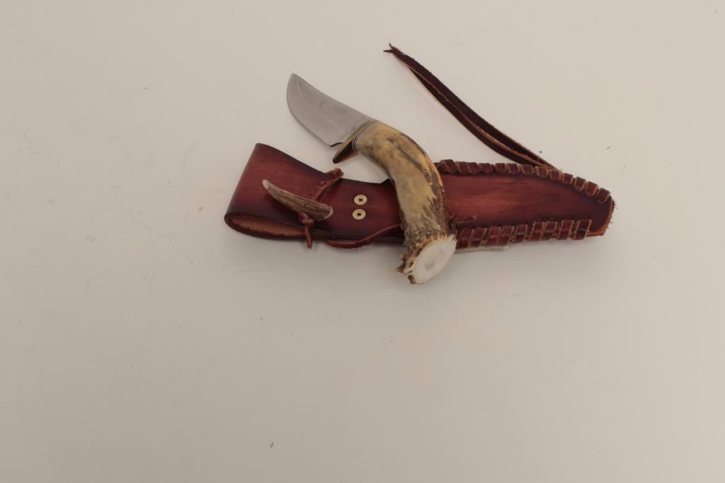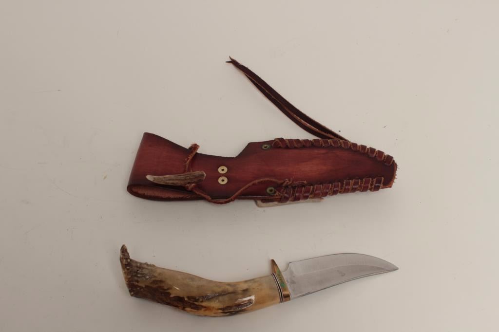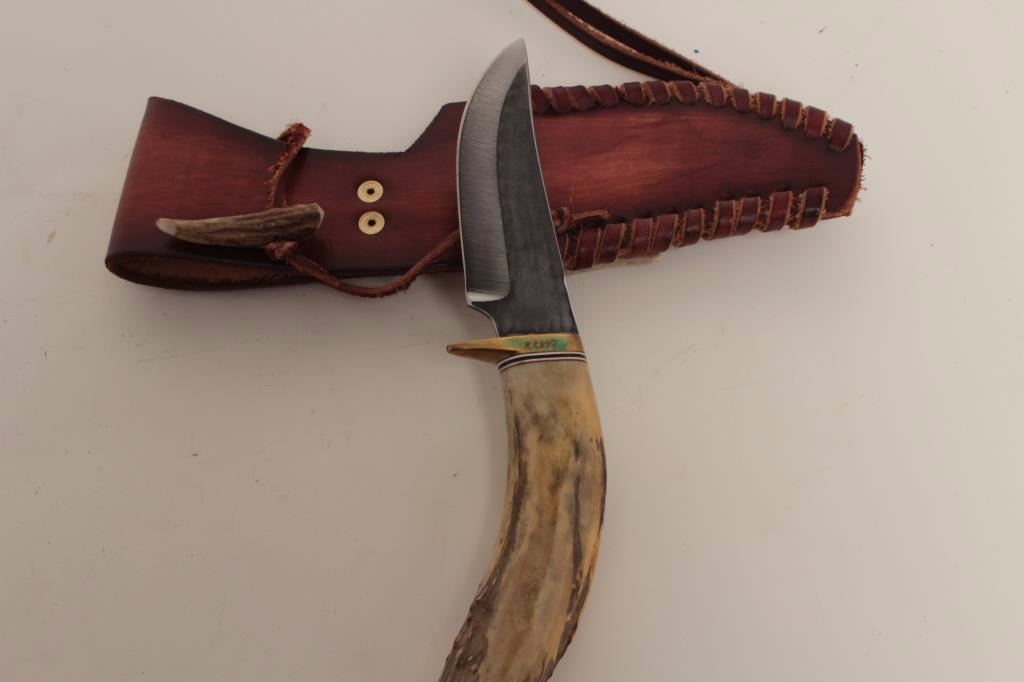 Custom knife with carved antler grip in very good overall condition. The custom knife features a 4 ¼” engine turned blade. The knife has a brass guard with red, black and white spacers added at the bolster. The grip is carved antler with the image of a moose tastefully carved into the scale. The knife is 9 ½” in total length. The blade does not appear to have been sharpened and has only lateral scratches from the sheath. Thecarved leather sheath is in very good condition with wrapped leather stitching. The knife is signed on the guard. Est.: $175-$350.