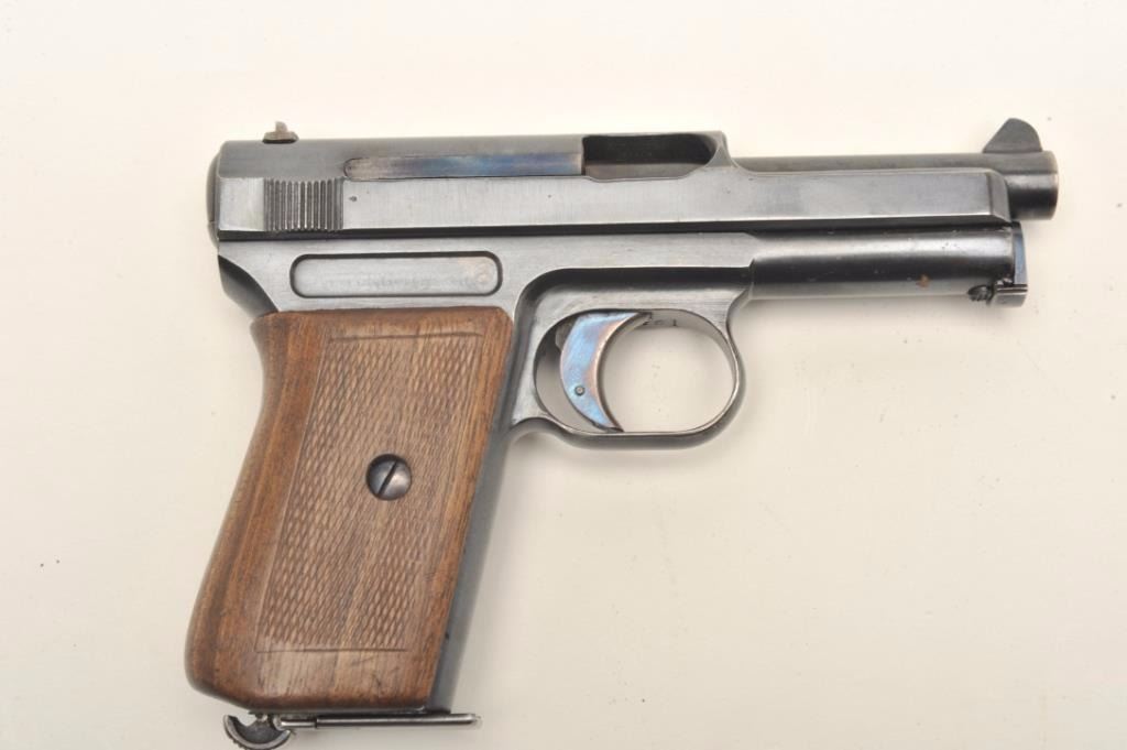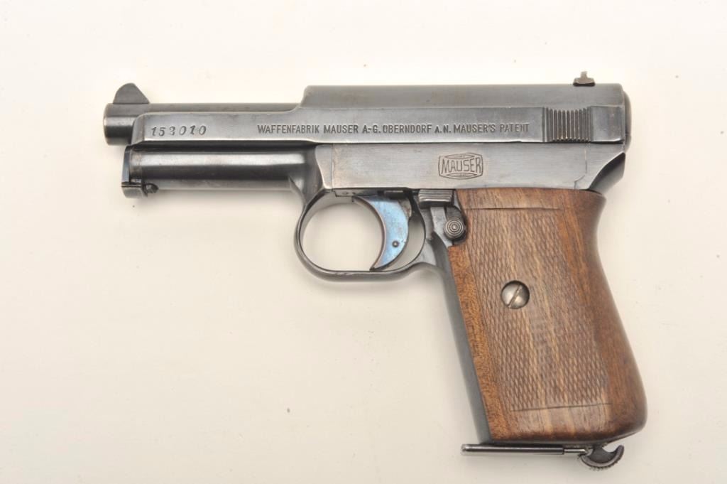 Mauser Model 1914 semi-auto pistol, 7.65 mm, serial #152010. The pistol is in very good overall condition with a 3 ¼” barrel. The pistol retains a significant amount of its blued finish with high point edge wear andlight wear at the muzzle. The pistol is marked,”WAFFENFABRIK MAUSER A.-G. OBERNDORF”. The trigger shows significant beautiful nitre blue and all visible serial numbers are matching. The checkered wood grips are ingood condition with flattening of the checkering and small mars. The pistol comes with one correct magazine. The bore is good, the action crisp and markings are sharp on this desirable Mauser pistol. Est.:$350-$700. (C+R).