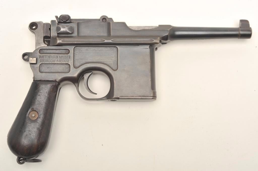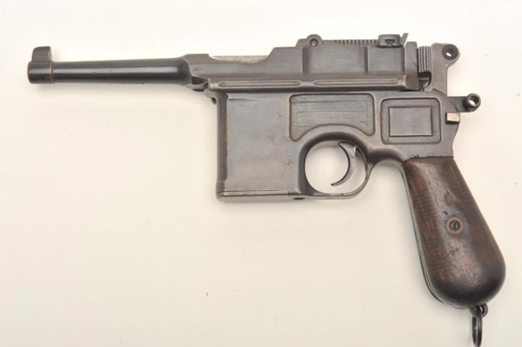 Mauser Model C-96 broom handle semi-auto pistol, 7.65mm, serial #62086. The pistol is in very good overall condition with a 4” import marked barrel with a military tangent style rear sight. The pistol retains asignificant amount of its blued finish with the remainder going to a grey patina. The smooth wood grips show moderate use with mars and compressions. A lanyard ring is situated at the base of the grip and the back strap is cut for a shoulder stock. The bore is good, the action crisp and markings are sharp on this Mauser C-96. Est.: $700-$1,200. (C+R).