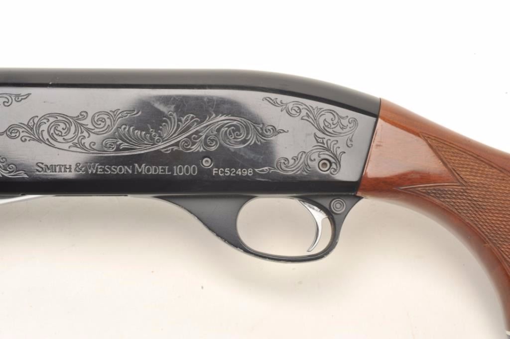 Smith & Wesson Model 1000 semi-automatic shotgun, 20 gauge, 26” ventilated rib barrel, blued finish, checkered wood stocks, S/N FC52498, in overall very good + condition showing the majority of its original finish,very good to fine bore, very good action, sharp markings and very good + wood. (Modern). Est.: $175-$350.