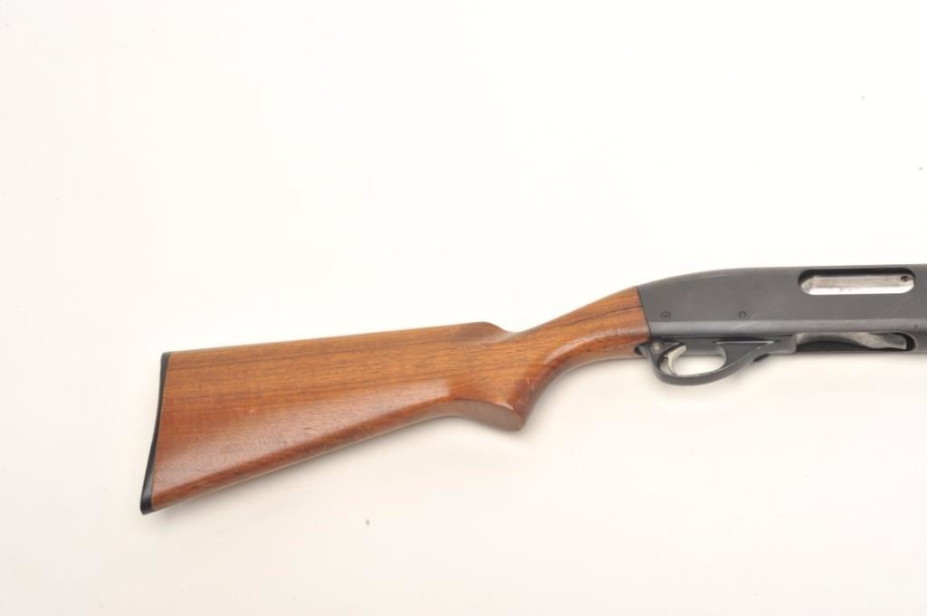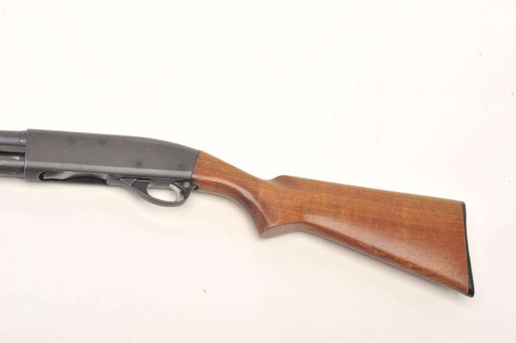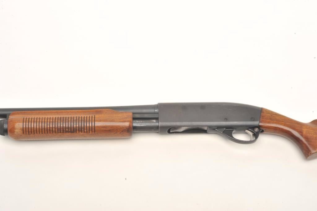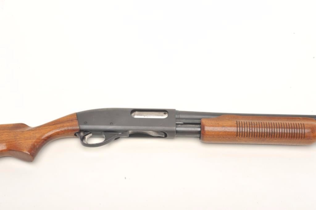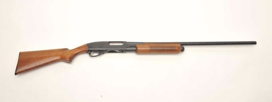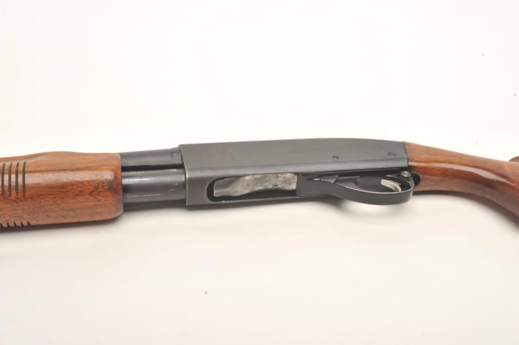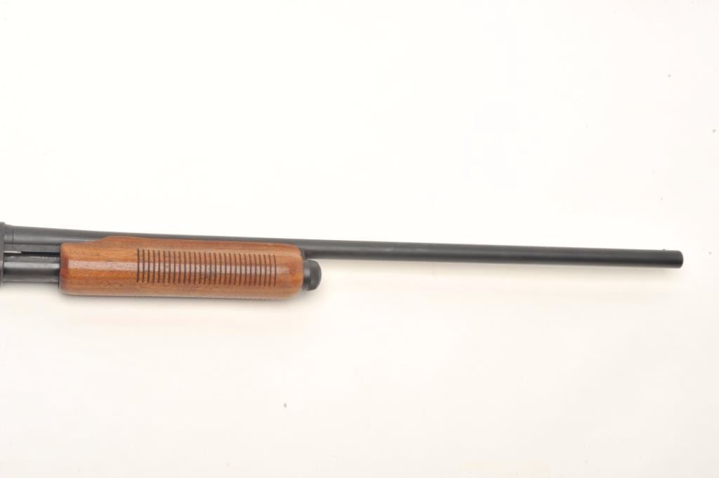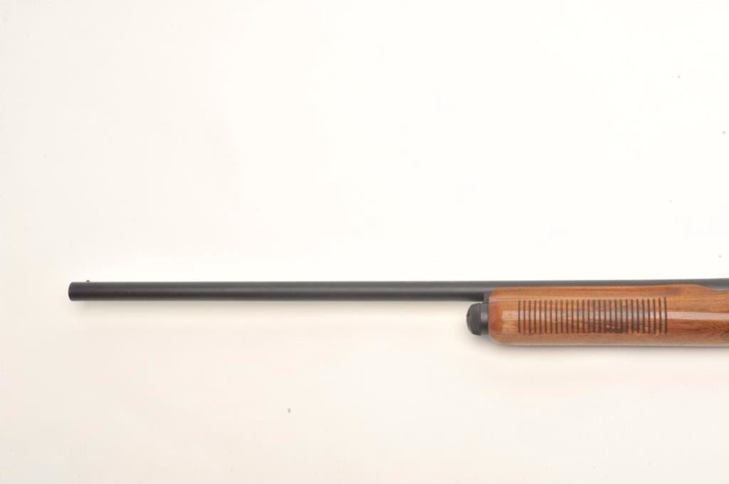 Remington Model 870 Wingmaster pump shotgun, 16 gauge, serial #599463W. The shotgun is in very good overall condition with a 28” barrel and a steel bead front sight. The barrel and receiver retain nearly all oftheir polished blue finish with small mars and light surface erosion noted. The smooth wood stocks are in good condition with small mars, dents and compressions consistent with field use. There is a 2” crack at theright wrist that does not go to the other side. The butt ends with a hard plastic Remington marked butt plate and a 14” LOP. The bore is very good, the action crisp and markings are sharp. Est.: $150-$300.(Modern).