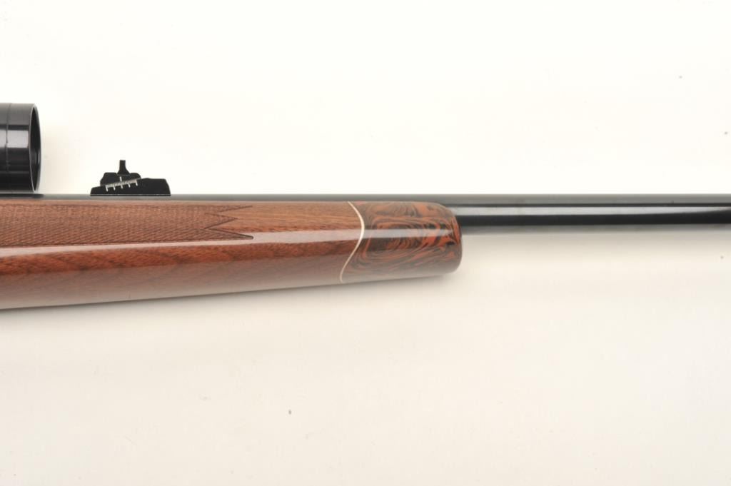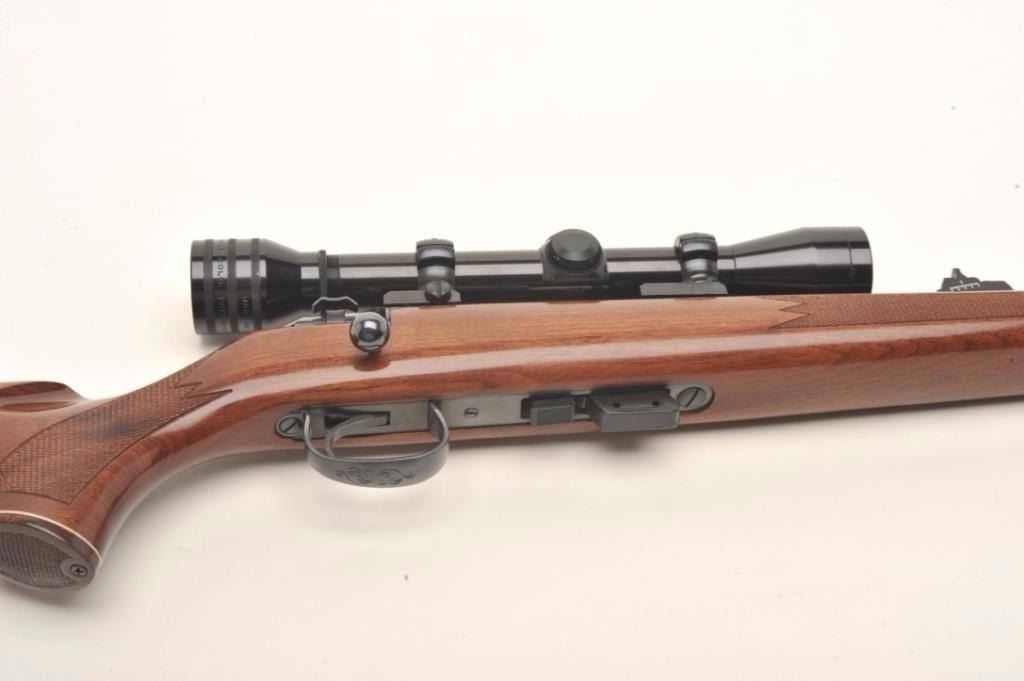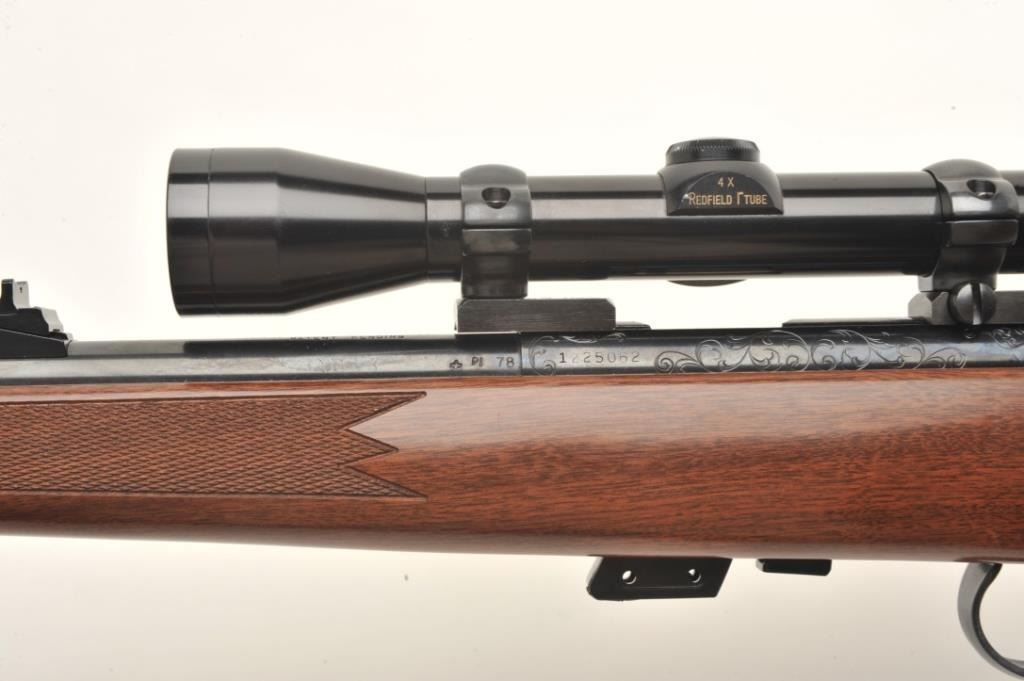 Remington Model 541-S Custom Sporter bolt action rifle, .22 Short, Long, Long Rifle caliber, serial #1225062. The rifle is in very good to nearly excellent condition with a 24” barrel with a hooded front andadjustable rear sights. The barrel retains nearly all of its blued finish as does the engraved receiver. The finely checkered wood stock is in very good condition showing only minor handling marks. The fore end, pistolgrip and butt plate are done in mottled red Bakelite. The bore is very good, the action crisp and markings are sharp on this desirable, lightly used Remington. The rifle is topped with two-piece Redfield mounts and a Redfield fixed 4x scope with clear, crisp optics. The lot includes one correct magazine. Est.: $350-$700. (Modern).