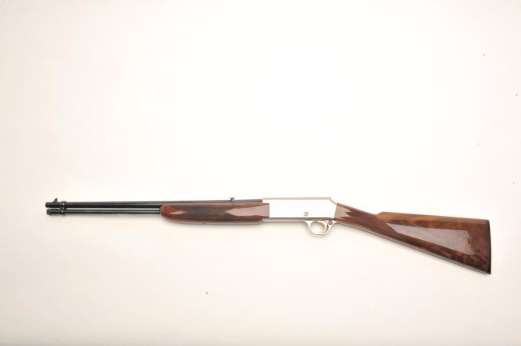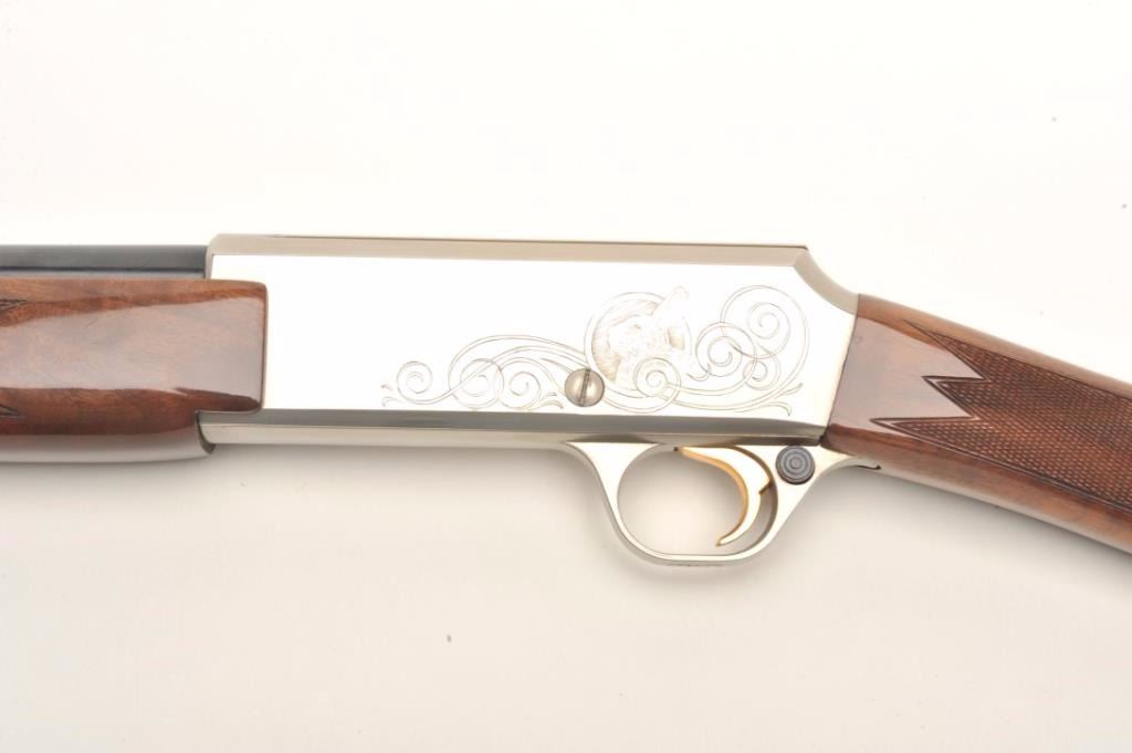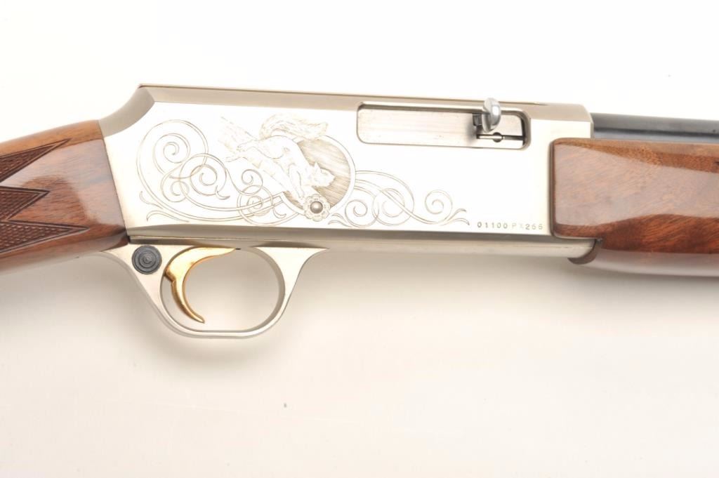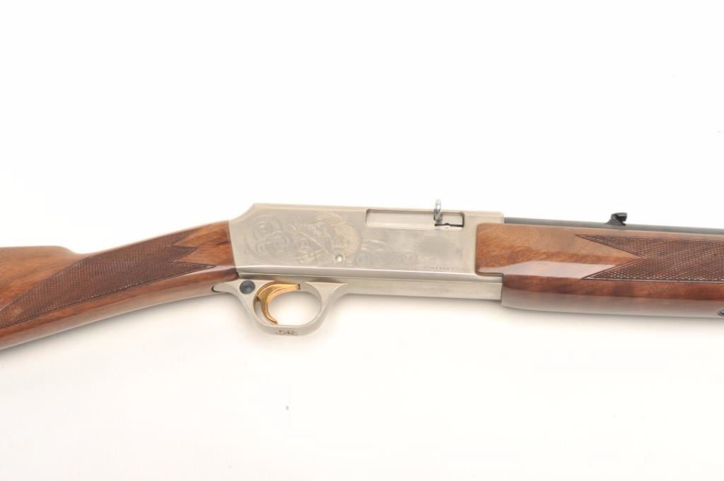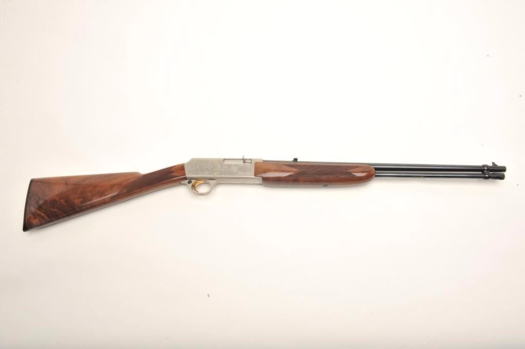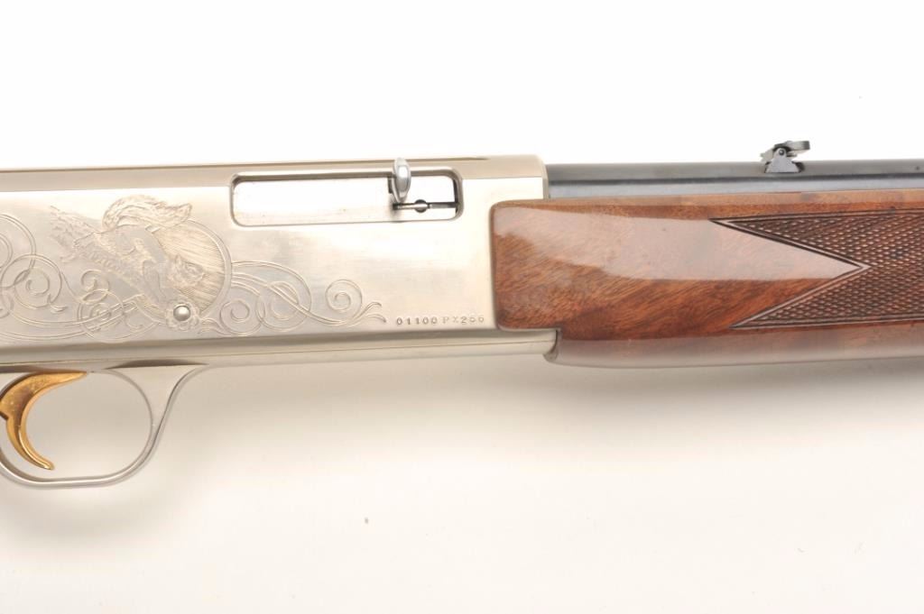 Browning BAR semi-automatic rifle, .22 LR caliber, serial #01100PX266. The rifle is in fine overall condition showing little, if any use. The rifle features a 20” round barrel with a post front and folding rearsights. The barrel and full-length magazine retain nearly all of their blued finish. The receiver is coin finished in the white with tasteful engraving on both sides of the action. The high gloss, checkered woodstocks are in very good condition with only light handling marks noted. The butt stock ends with a Browning marked plastic butt plate. The bore is very good, the action crisp and markings are sharp on thisdesirable, Japanese made Browning. Est.: $800-$1,600. (Modern).