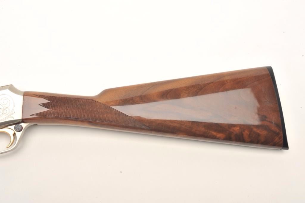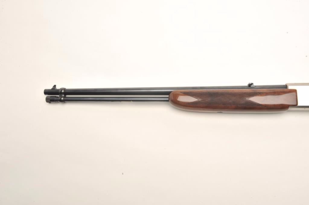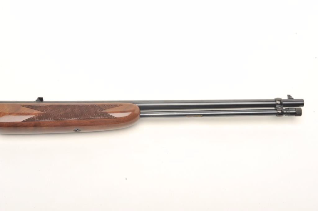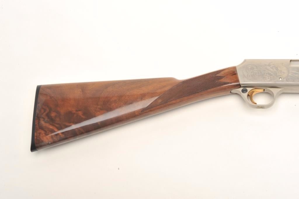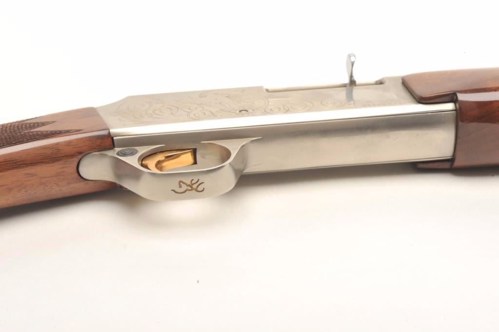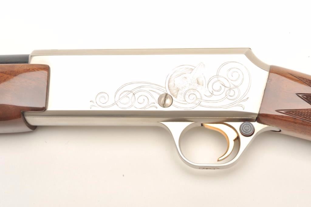 Browning BAR semi-automatic rifle, .22 LR caliber, serial #01100PX266. The rifle is in fine overall condition showing little, if any use. The rifle features a 20” round barrel with a post front and folding rearsights. The barrel and full-length magazine retain nearly all of their blued finish. The receiver is coin finished in the white with tasteful engraving on both sides of the action. The high gloss, checkered woodstocks are in very good condition with only light handling marks noted. The butt stock ends with a Browning marked plastic butt plate. The bore is very good, the action crisp and markings are sharp on thisdesirable, Japanese made Browning. Est.: $800-$1,600. (Modern).