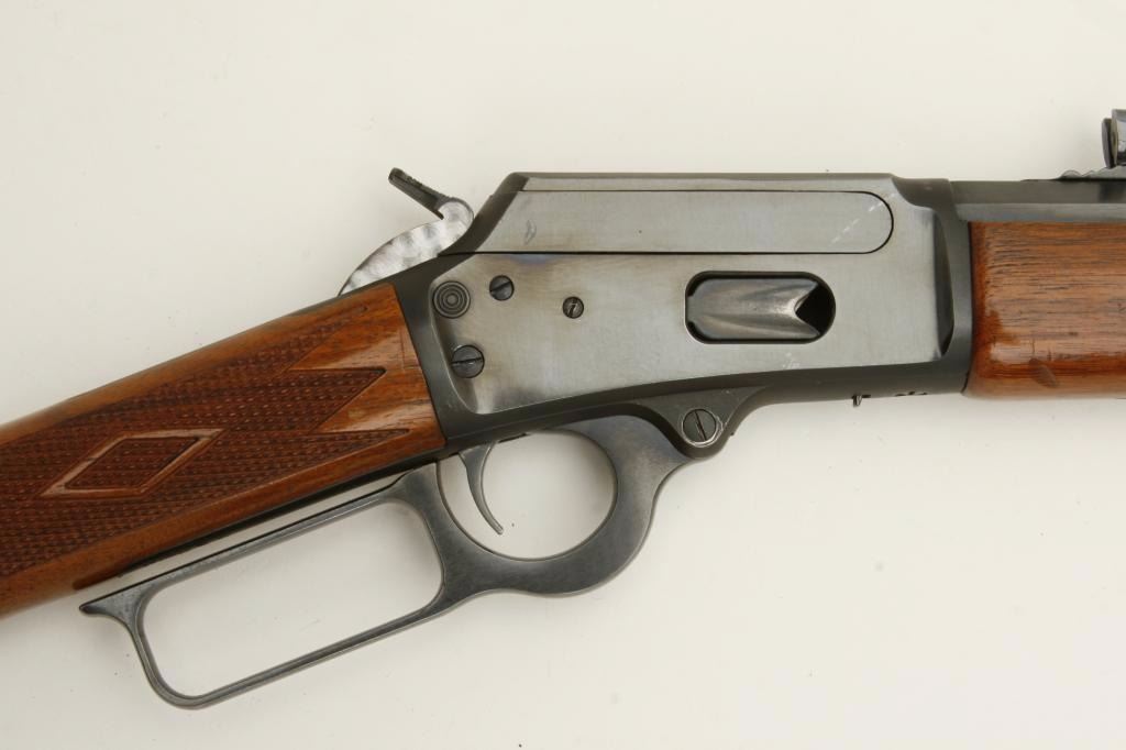 Marlin Model 1894CB “Cowboy Limited” lever action rifle, .357 Mag/.38 SPL. caliber, serial #03027213. The rifle is in very good overall condition with a 24” octagon barrel. The barrel and full-length magazine retainthe majority of their blued finish as does the receiver. The bolt and hammer have been engine turned and polished. The checkered wood stocks are in good condition with mars and compressions consistent with field usage. The butt stock ends with a Marlin marked, plastic butt plate, which has been covered with felt. The bore is very good, the action crisp and markings are sharp. (Modern) Est.: $500-$1,000.