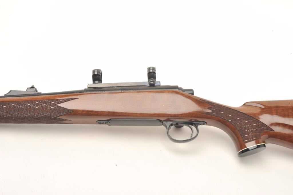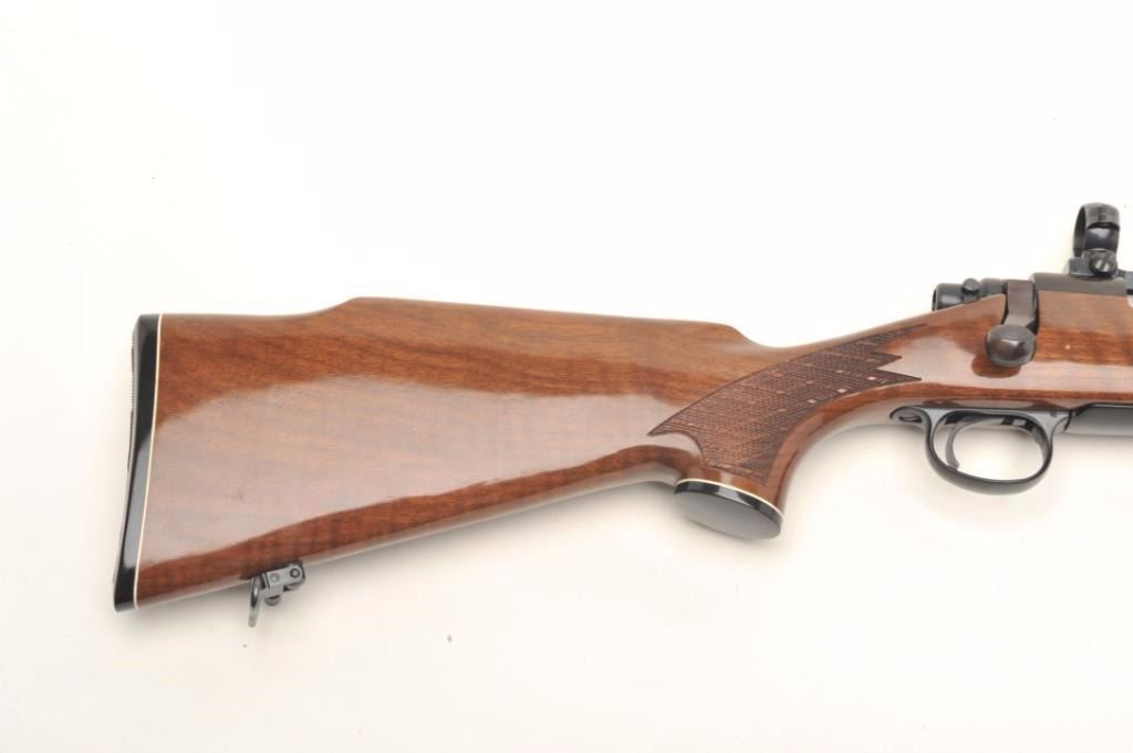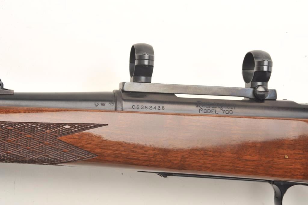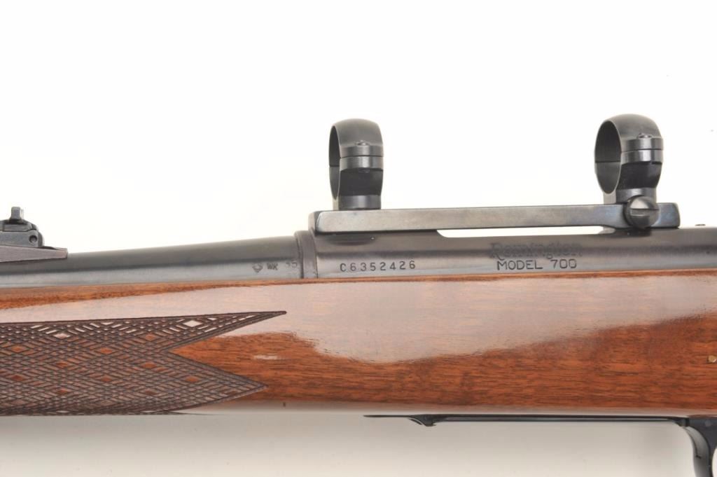 Remington Model 700 bolt action rifle, .17 Remington caliber, serial #C6352426. The rifle is in very good overall condition showing little use. The rifle has a 24” barrel with hooded front and adjustable rearsights. The barrel and receiver retain nearly all of their blued finish, showing only handling marks. The rifle is topped with a Leupold one-piece scope mount and rings. The checkered wood stock is in verygood condition as well with only small storage marks noted. The buttstock includes sling swivels and ends with a plastic, Remington marked butt plate. The bore is very good, the action crisp and markings aresharp. Est.: $700-$900. (Modern).