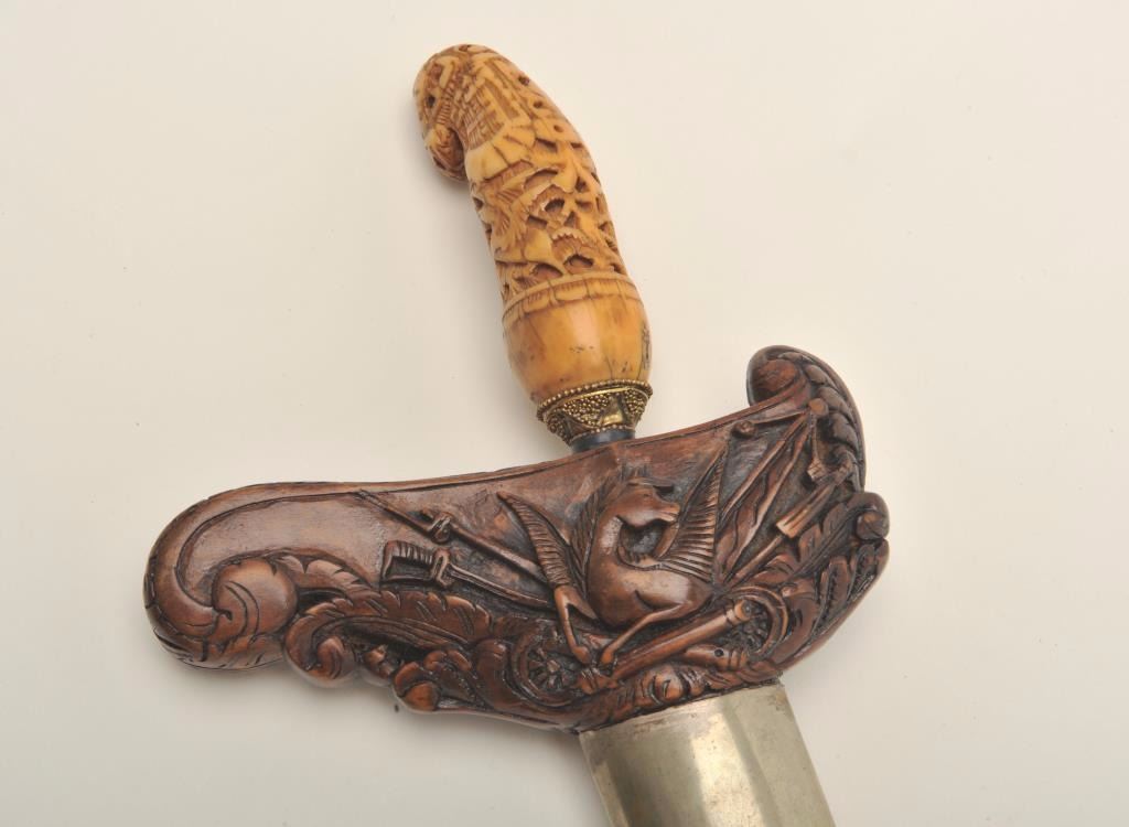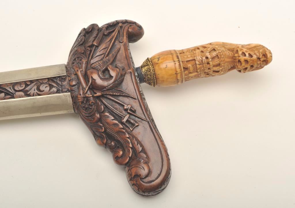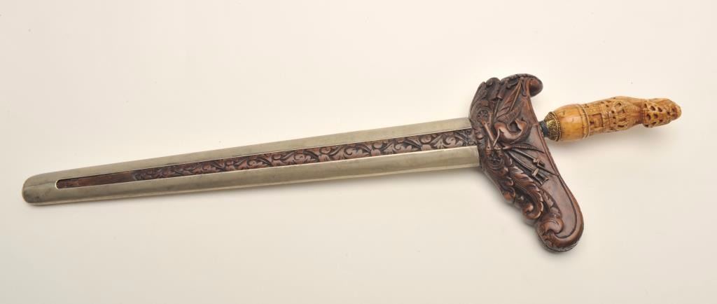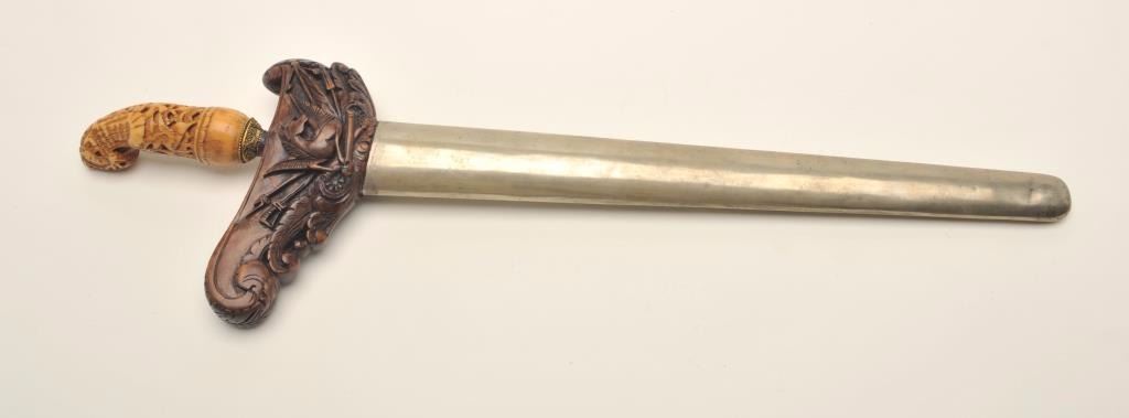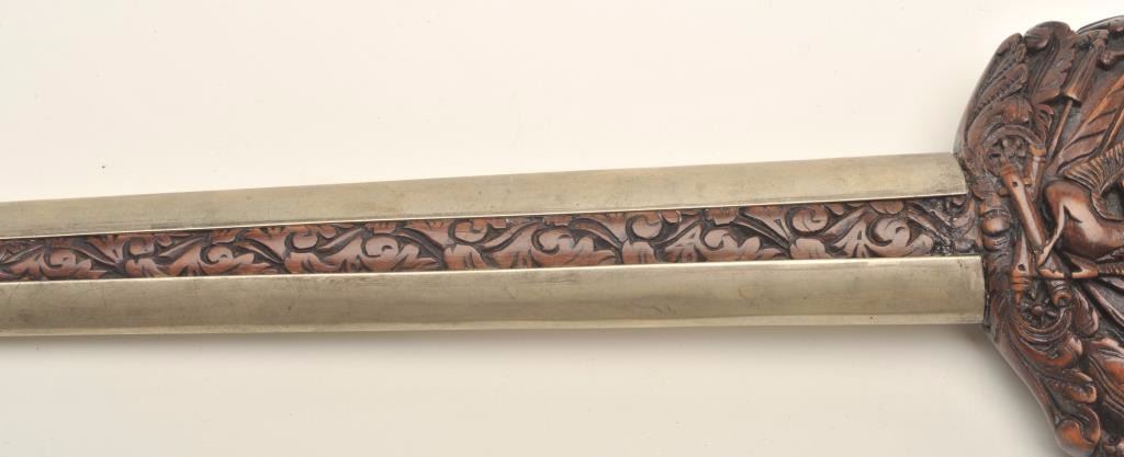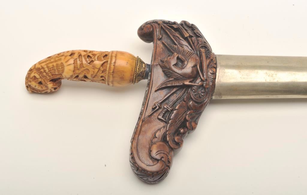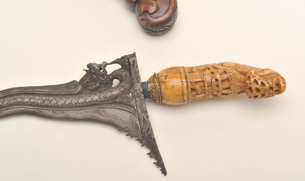 Lot 584 Fancy Kris from Indonesia with ornate scabbard and carved grip. Meteorite steel blade. Good condit