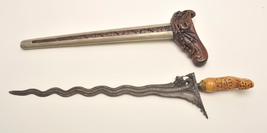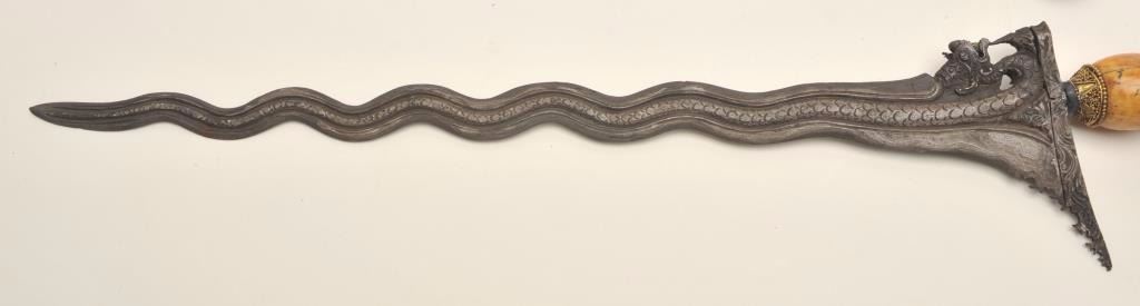 Fancy Kris from Indonesia with ornate scabbard and carved grip. Meteorite steel blade. Good condition. 100 years old approx. Est:$600-1,200.