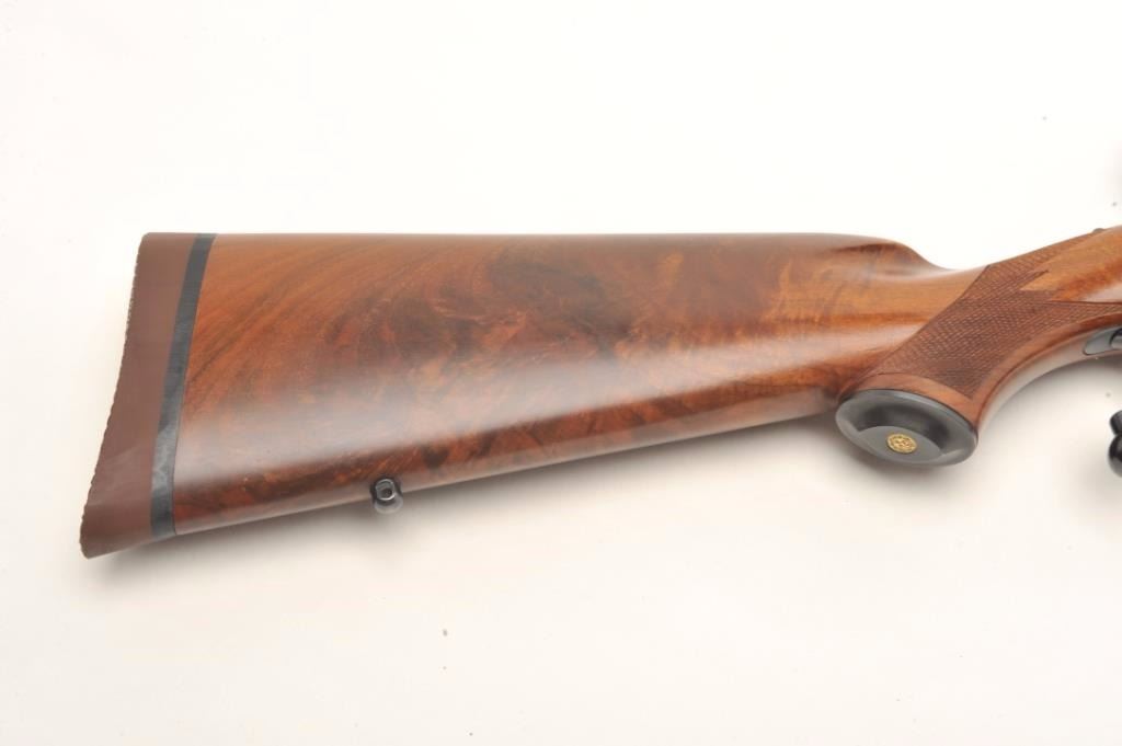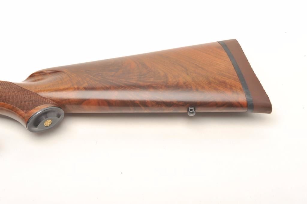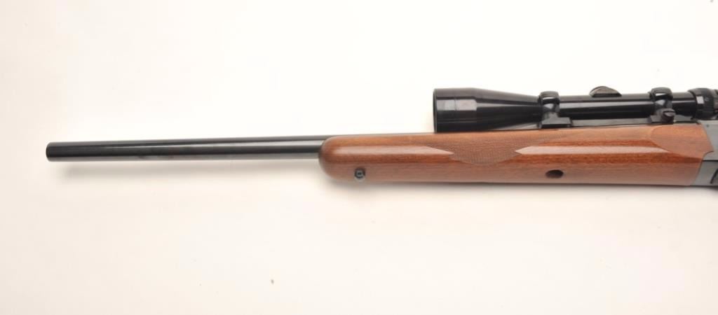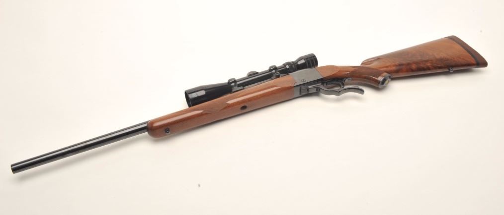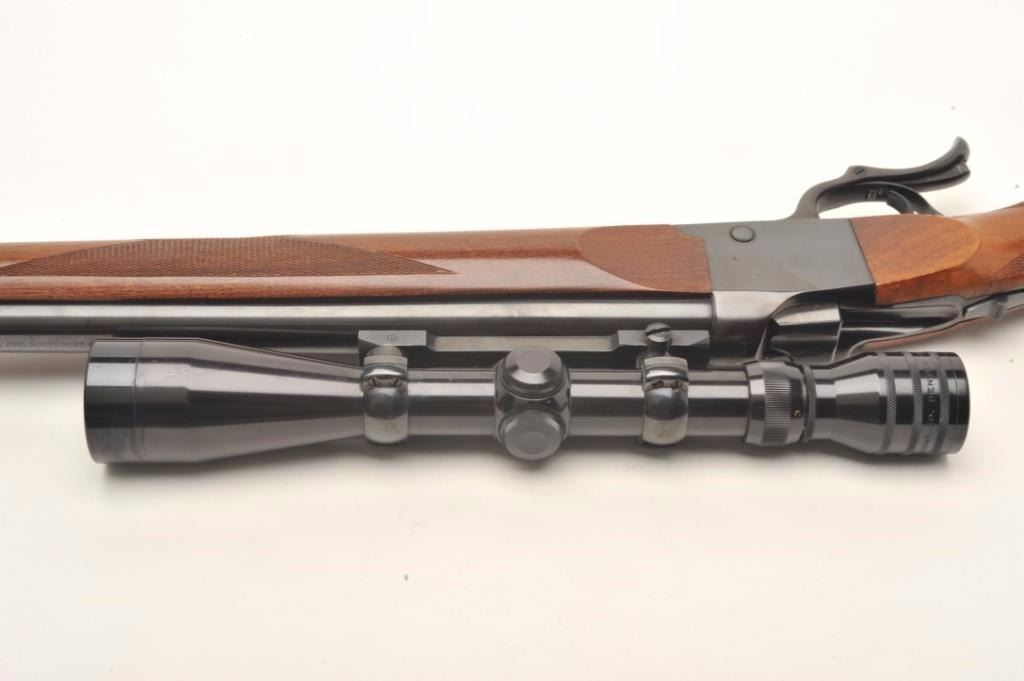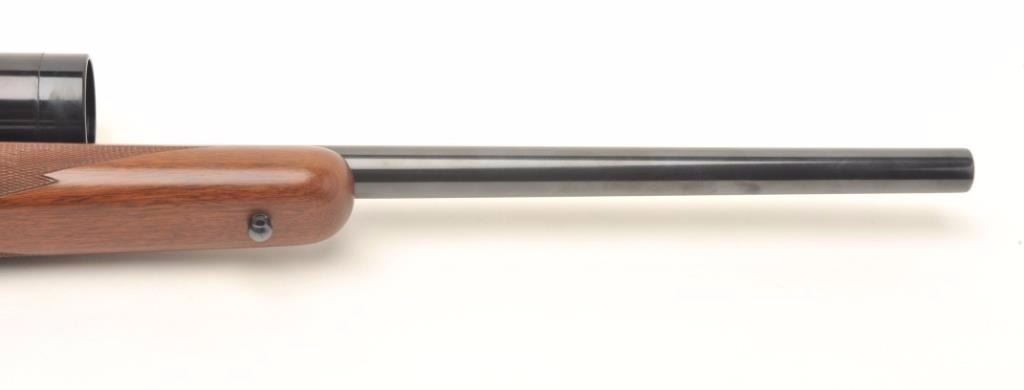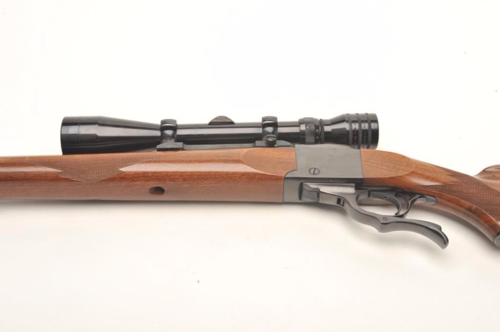 Ruger No. 1 single shot rifle, .25-06 caliber, serial #13001689. The rifle is in very good overall condition with a 24” medium heavy barrel. The barrel and receiver retain nearly all of their blued finish withonly slight handling marks noted. The rifle has the desirable tang mounted safety. The checkered wood stocks are in very good condition with only storage wear. The butt stock features beautiful figure and grainingand ends with a rubber recoil pad. The rifle is topped with a Redfield 3x9x40 variable power scope. The bore is very good, the action crisp and markings are sharp. The rifle comes with the original box. Est.:$800-$1,200. (Modern).