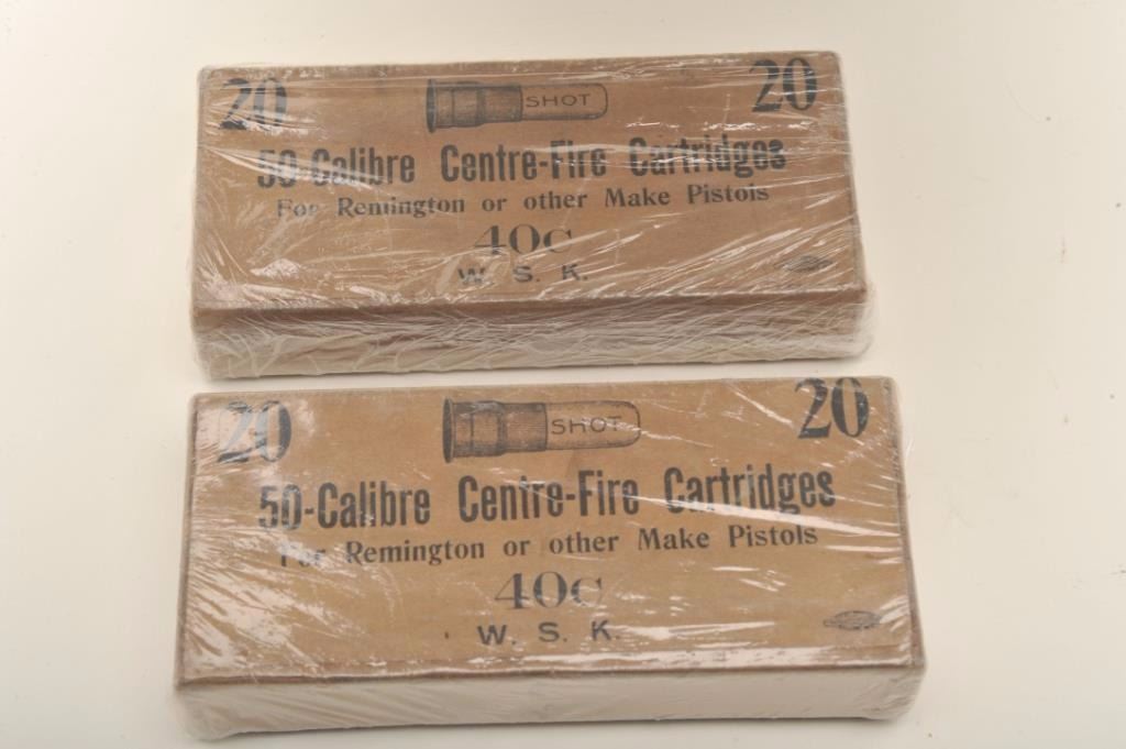 W.S.K. (Stokes Kirk) .50 caliber shot for Remington Rolling Block pistol; one full box and one empty box from the Jerry Landskrom collection. Est.: $200-$400.
