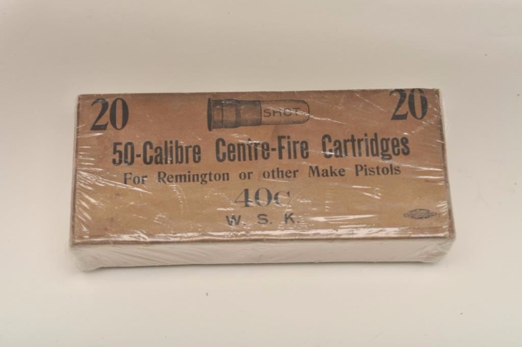Lot 602 W.S.K. (Stokes Kirk) .50 caliber shot for Remington Rolling Block pistol; one full box and one em