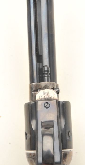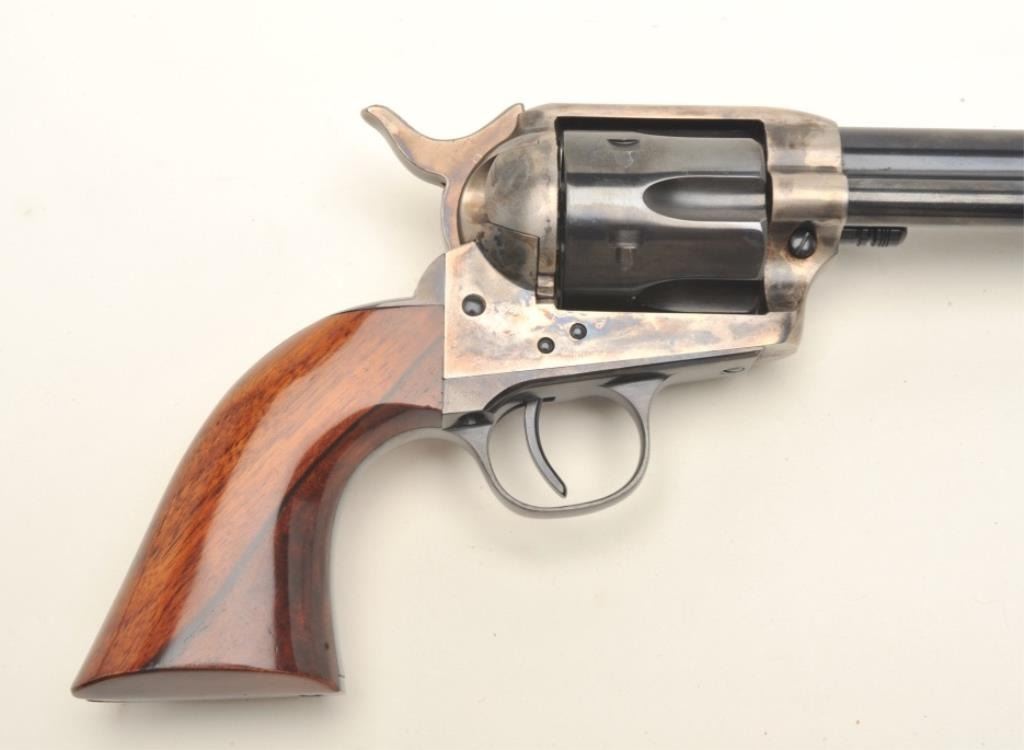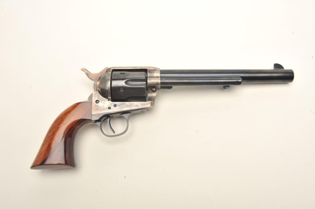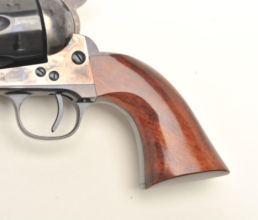Uberti modern copy (Cattleman’s Model) of a Colt SAA revolver, .45 LC caliber, 7.5” barrel, blued and case hardened finish, smooth wood grips, S/N J18799, in excellent condition showing little handling, in factory cardboard box, beautifully grained grips. (Modern/PPT). Est.: $300-$600.