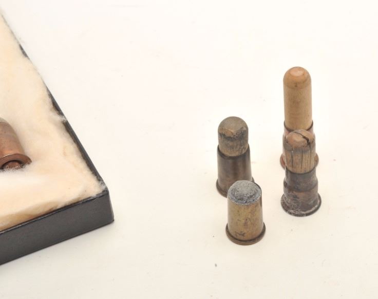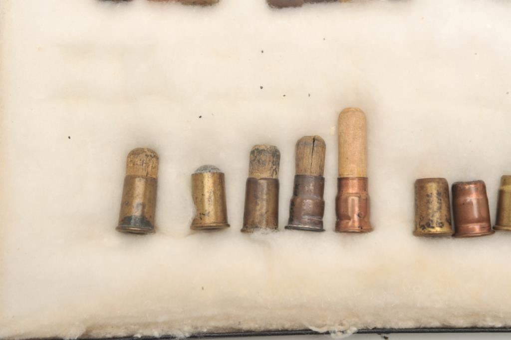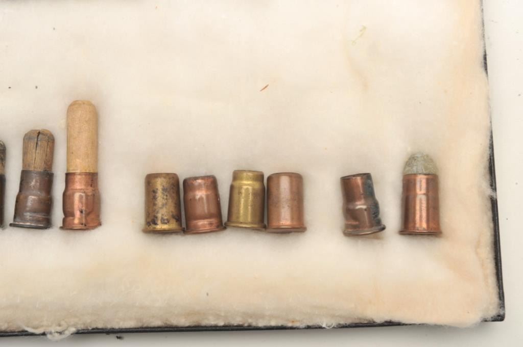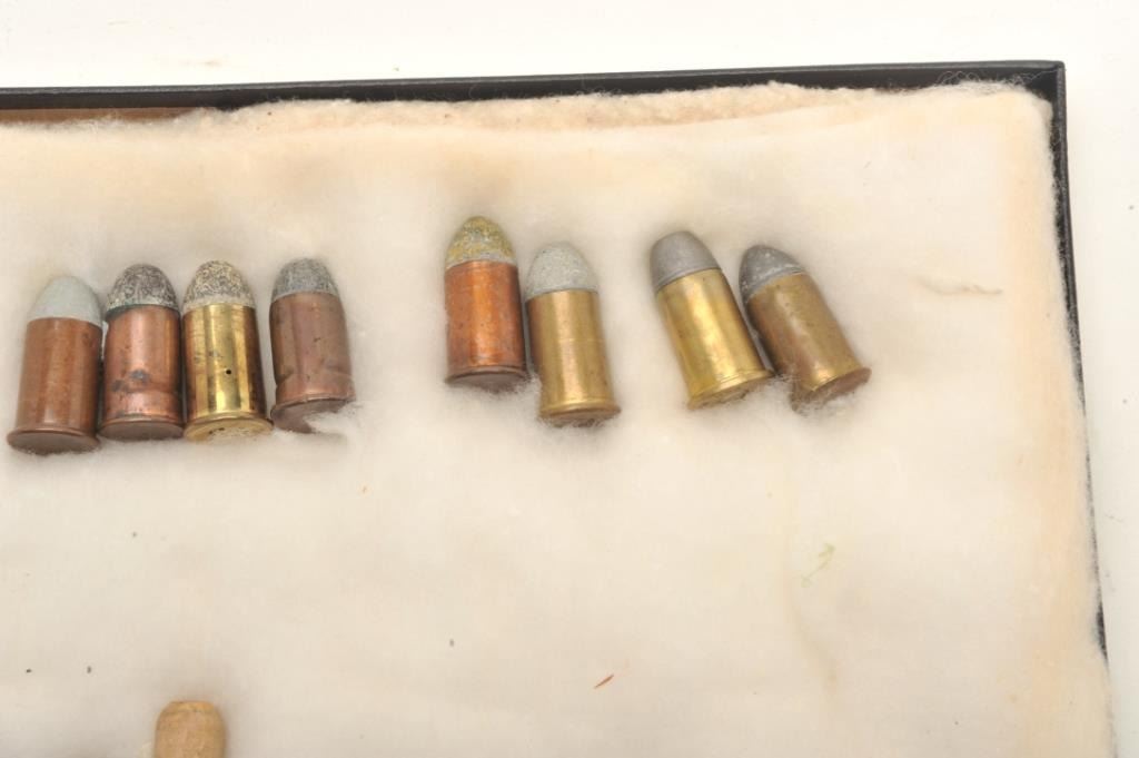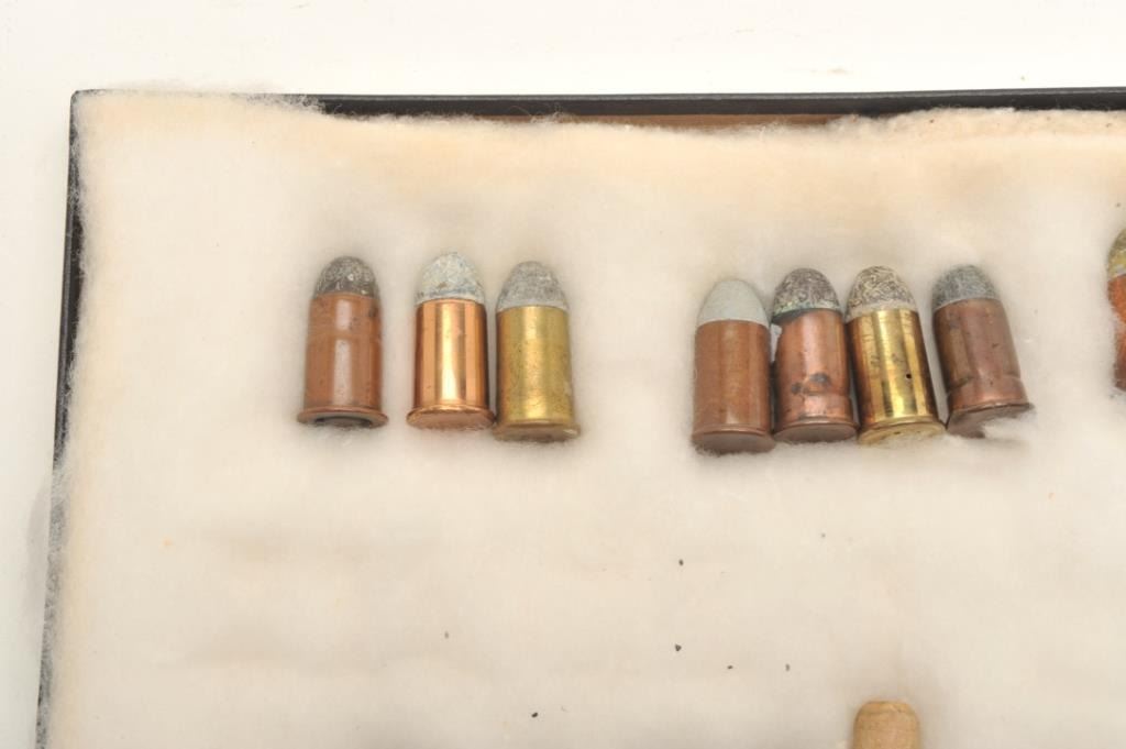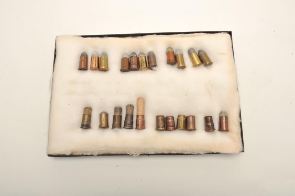 Twenty-two different and rare .50 caliber Remington Rolling Block pistol cartridges in riker case; Ex-Landskrom collection; all known variations from pre-eminent author on Rolling Block pistols and consigned by him. Est.: $400-$800.