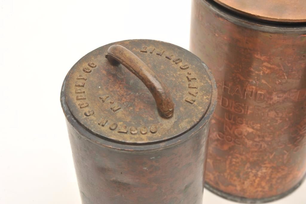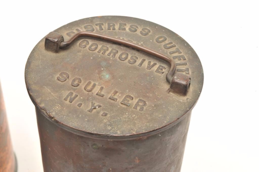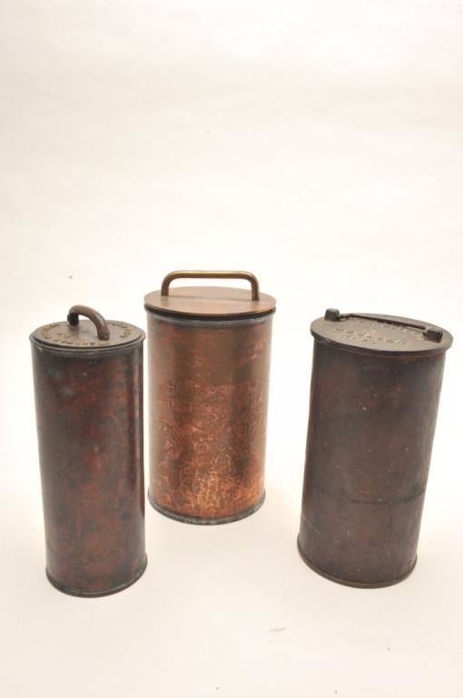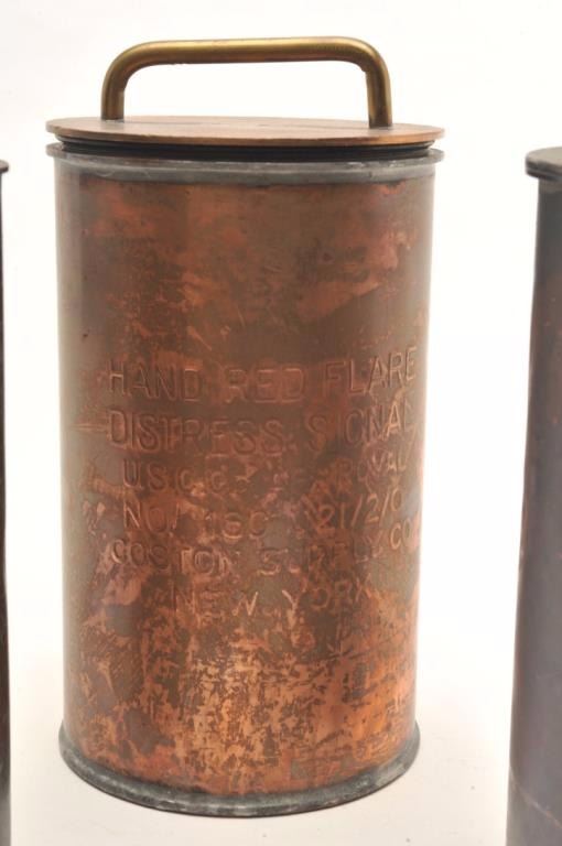 Lot of 3 bronze flare storage canisters for a ship or lifeboat; one marked on side, two marked on lids; each is approximately 10.25” in height. Est.: $200-$400.