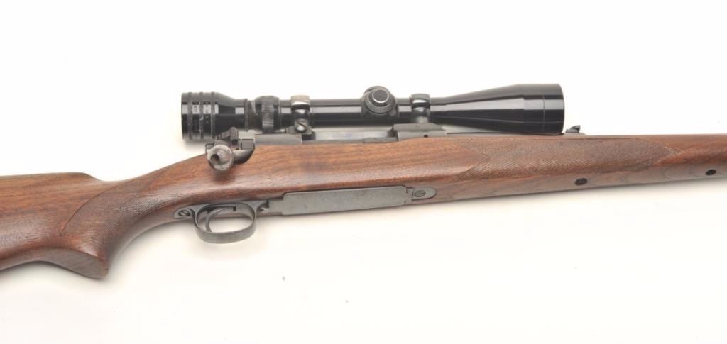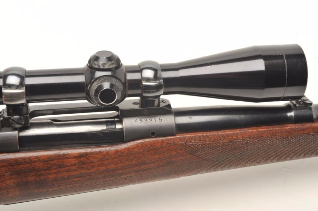 Pre-64 Winchester Model 70 bolt action rifle, .270 Win. caliber, 24” round barrel, blued finish, checkered wood stock, S/N 453215, in overall good to very good condition displaying the majority of its original bluefinish, some scattered spots of erosion and pinprick pitting, crisp action, sharp markings, very good bore and stock; mounted with a Redfield 3X-9X scope showing crisp optics. (C&R). Est.: $800-$1,600.