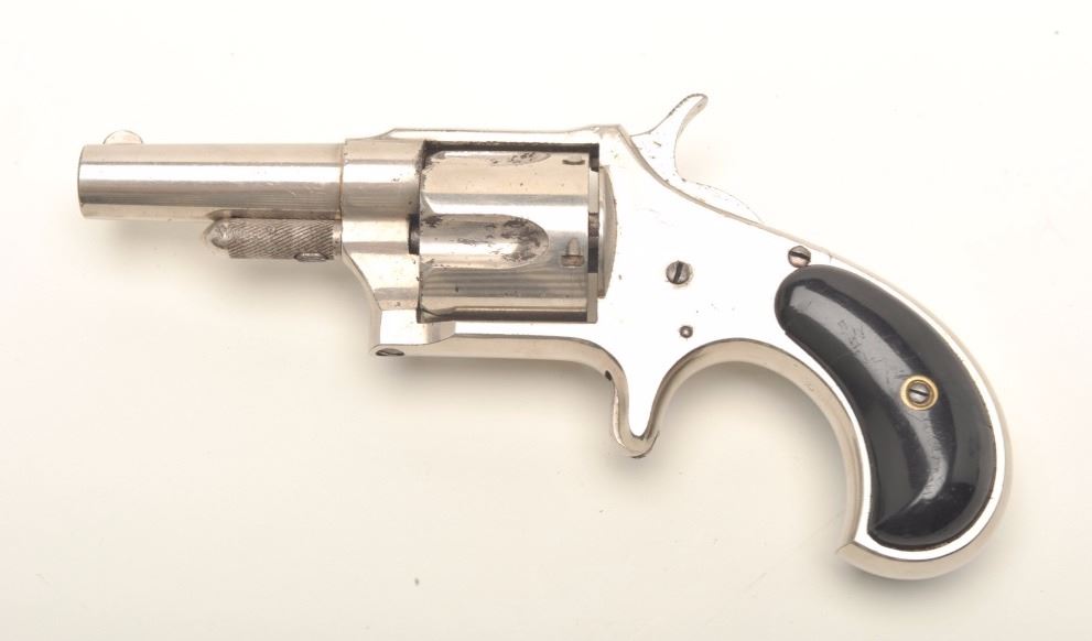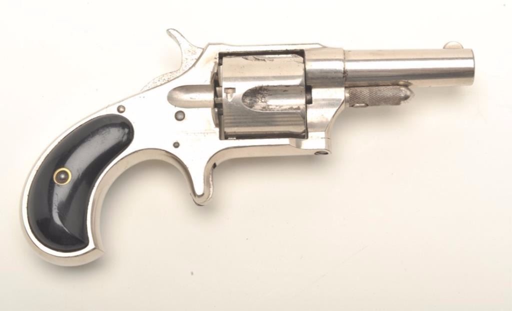 Remington Smoot Model #4 spur trigger revolver, .38RF caliber, 2.5” round barrel, nickel finish, wood grips, S/N 3474 in overall very good to near fine condition. (Antique). Est.: $400-$800.