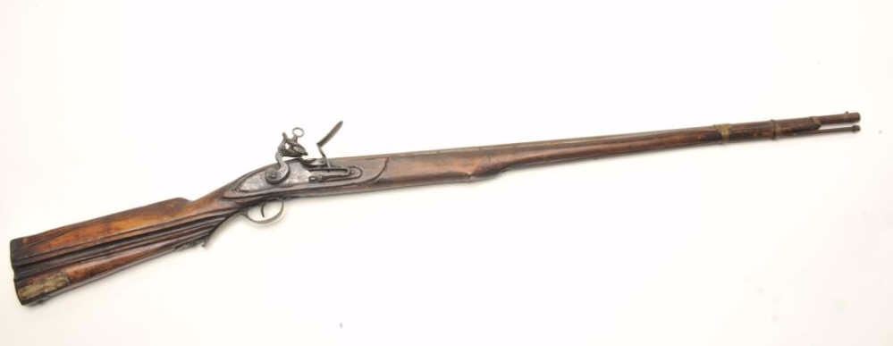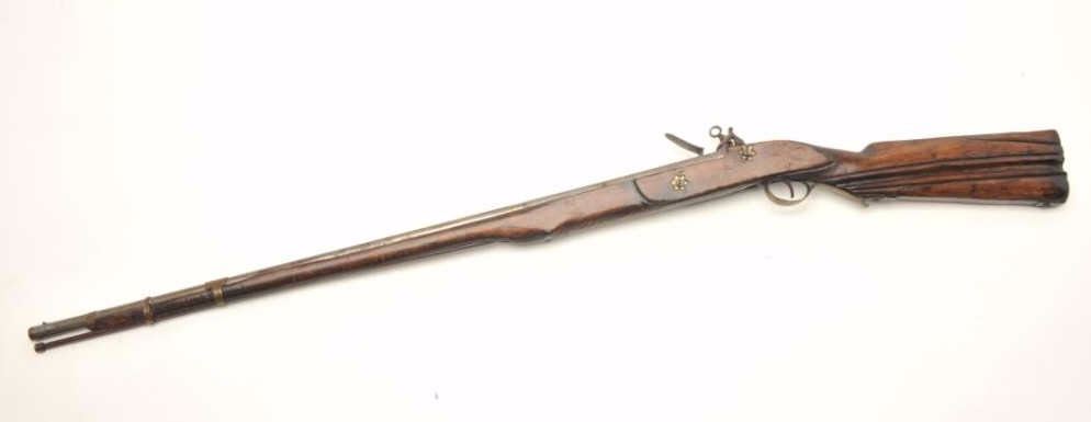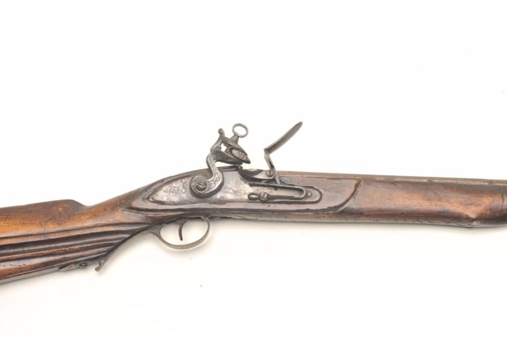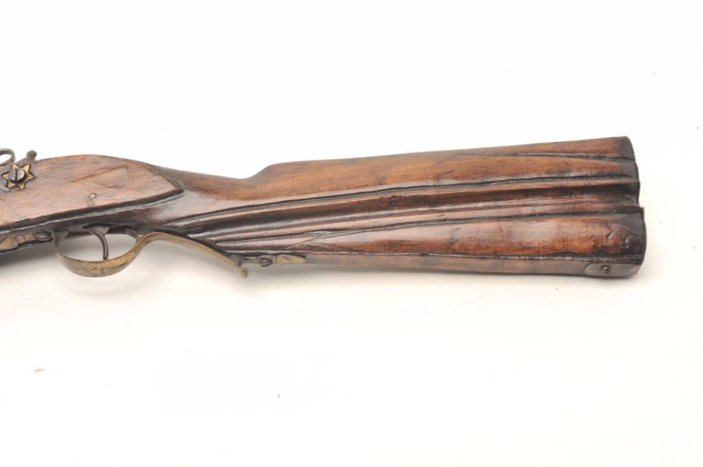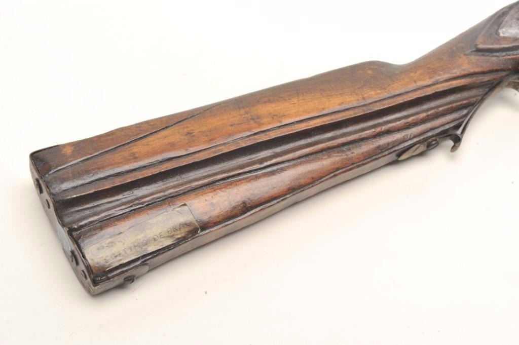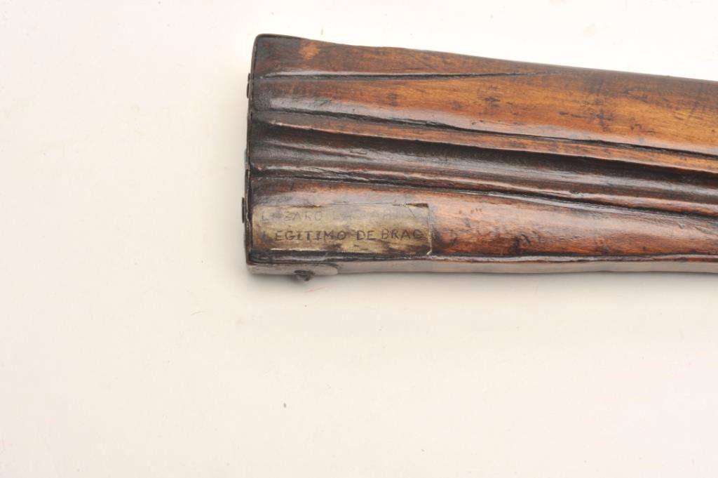 Flintlock rifle, approximately .45 caliber, serial #NSNV. The rifle is in good overall condition with a 31 ¾” octagon to round barrel. The rifle is marked, “LAZARO LAZARIN LEGITIMO DEBRAG”. The barrel and receiverhave entirely to a grey patina with numerous proof marks and some scroll engraving. The smooth wood stock is weathered but complete with brass barrel bands and carved butt stock with smooth metal butt plate. The ramrod is intact. Est.: $250-$500. Antique.