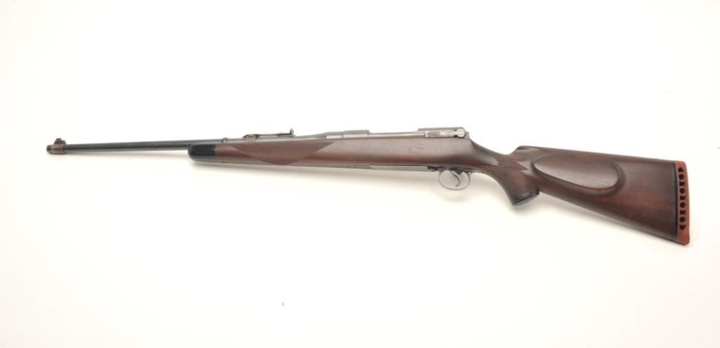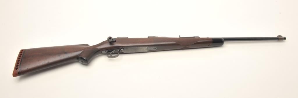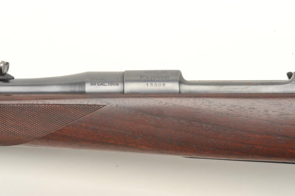 Remington Model 30 Express bolt action rifle, .30 caliber, serial #15508. The rifle is in very good overall condition with a 22” barrel. The barrel retains the majority of its muted blued finish with light surfacefreckling and some loss of finish at the muzzle. The receiver retains significant blued finish with thinning at the magazine cover and light surface rust on the left side of the action. The checkered wood stock isin good condition with some flattening of the checkering and small mars consistent with use. The butt stock ends with a ventilated rubber pad. The bore is good and may clean. The action is crisp and markings are sharpon this desirable Model 30. Est.: $300-$500. (C+R).