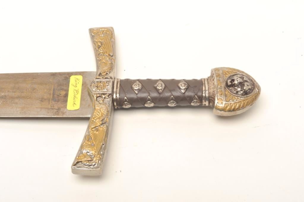 Older reproduction of King Richard’s sword, approximately 39” overall with a 33” decorated blade. Est.: $150-$300.